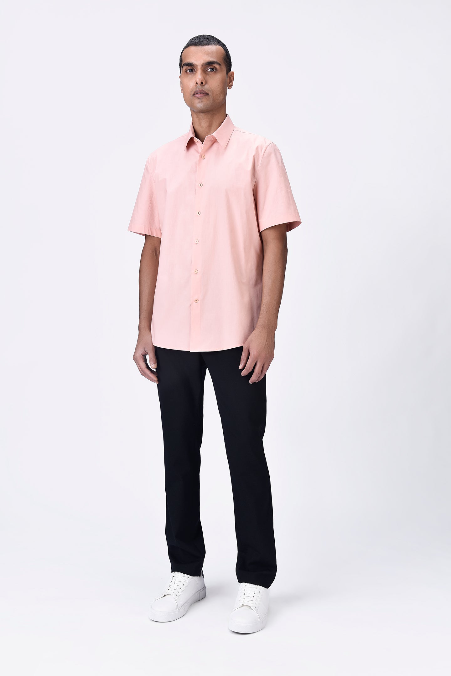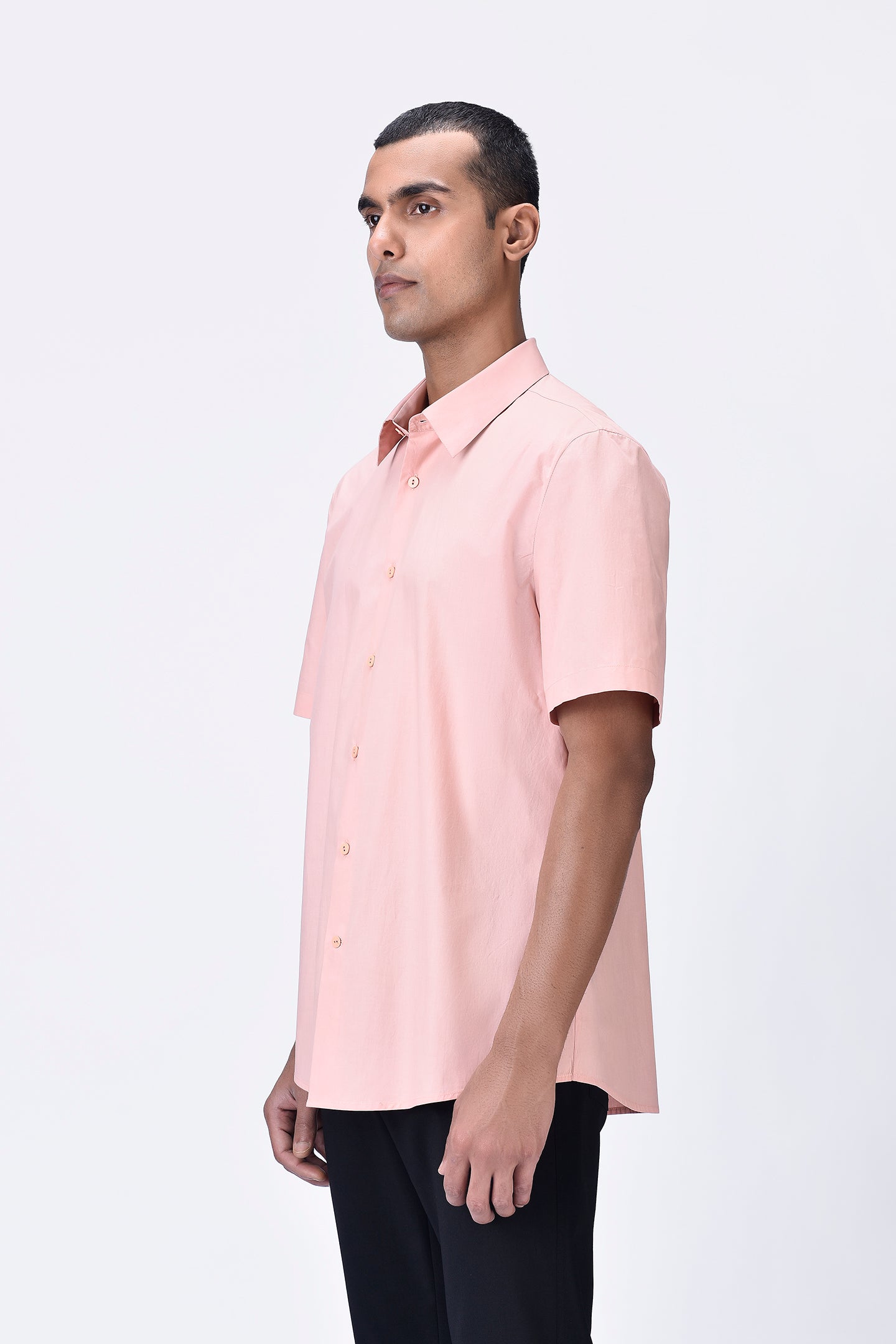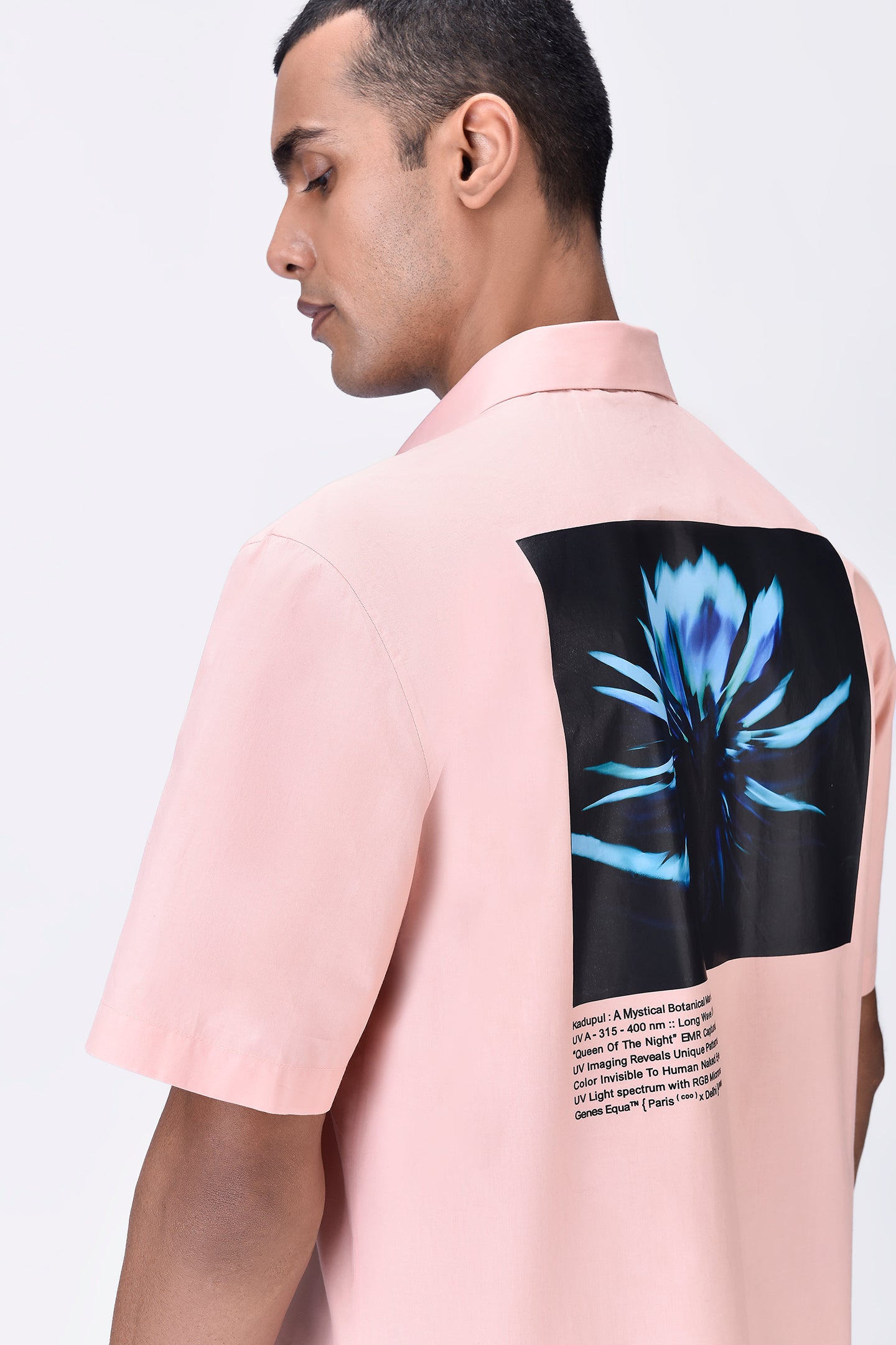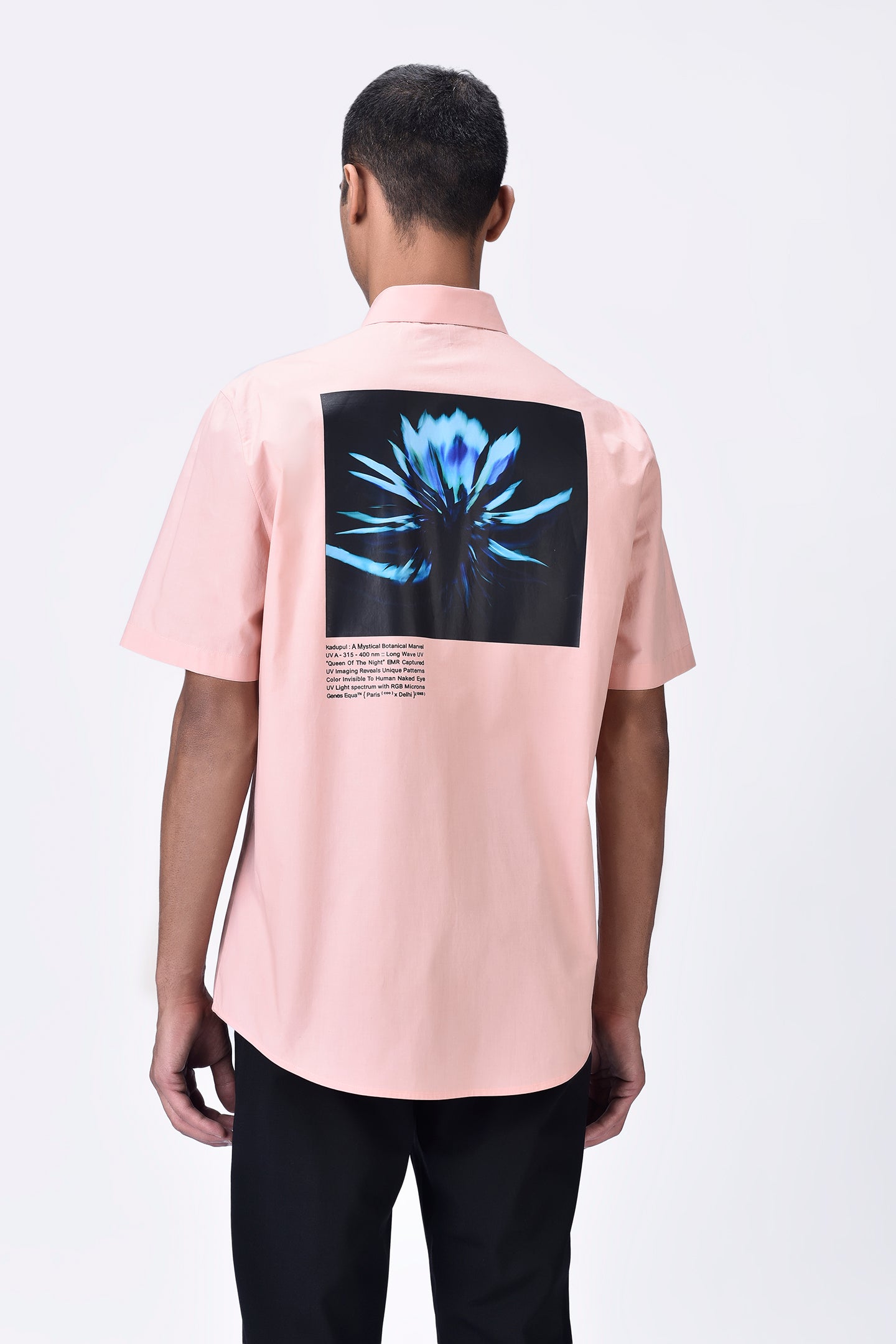 Regular fit half-sleeve shirt in melon pink Giza cotton poplin with a UV flower sticker placed on the back. Bright and playful for a fresh look.