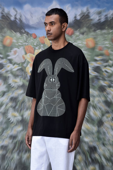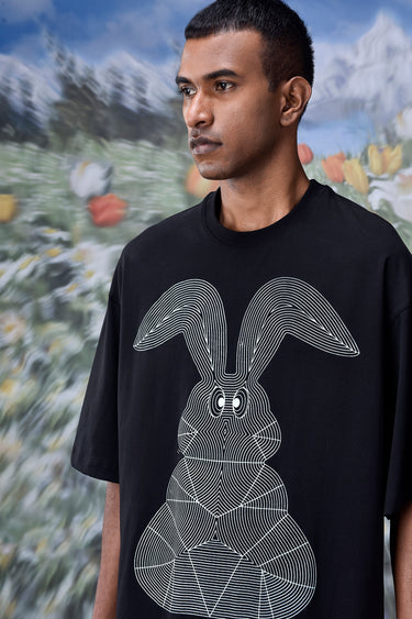 Presenting our Linear Rabbit T-Shirt in Black where detail is echoed in the Linear Rabbit print, where a familiar motif becomes eccentric through thoughtful print language.