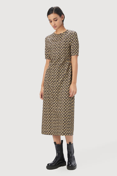 Increase your charm with our slim-fit raised-neck dress, a masterpiece that beautifully merges modernity and charm. The captivating overall scallops print adds a touch of playfulness to your attire, making a statement that's uniquely yours. The raised neck design exudes contemporary sophistication, while the uneven dart placements on the neck and sleeves create an artistic asymmetry, setting this dress apart.