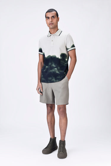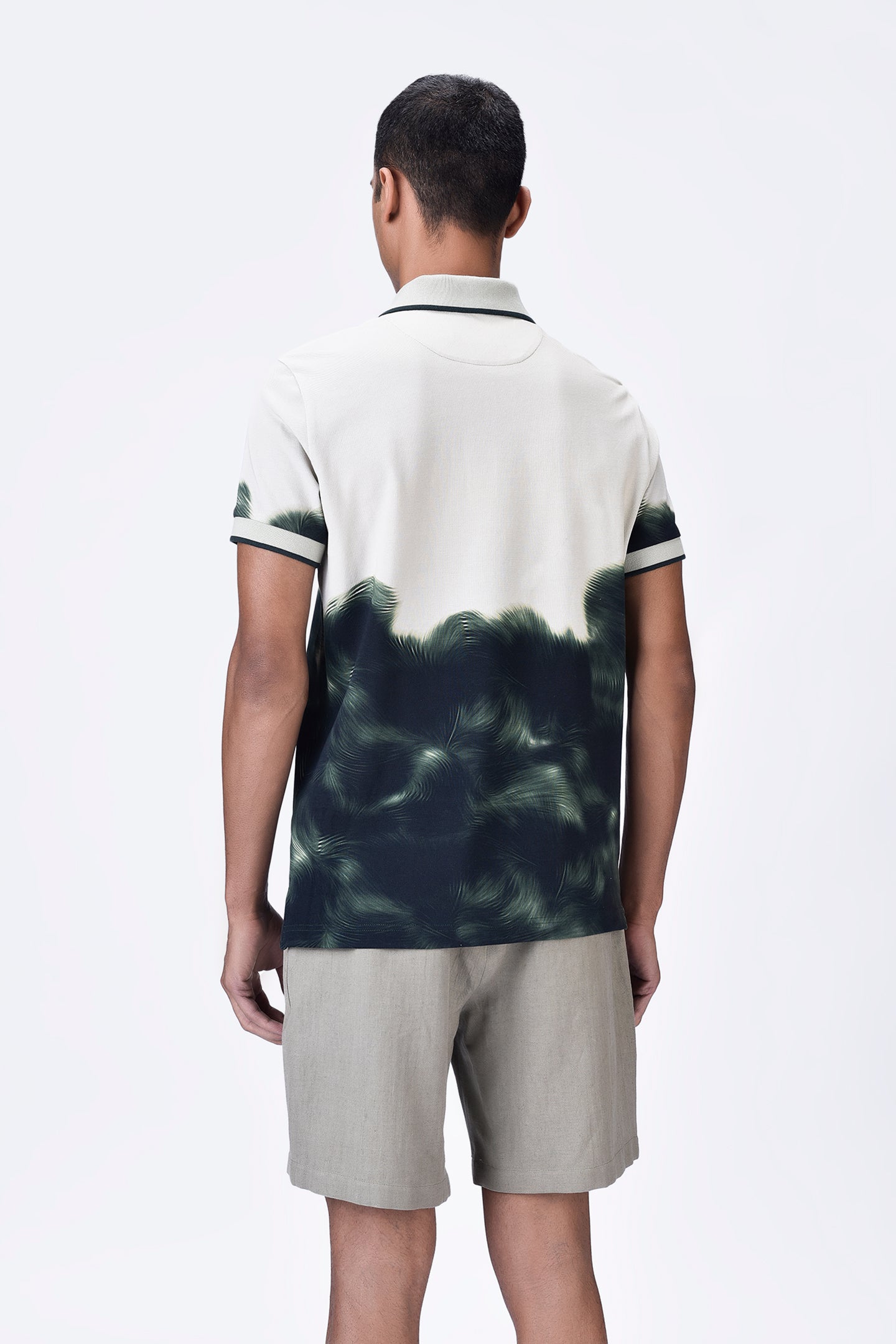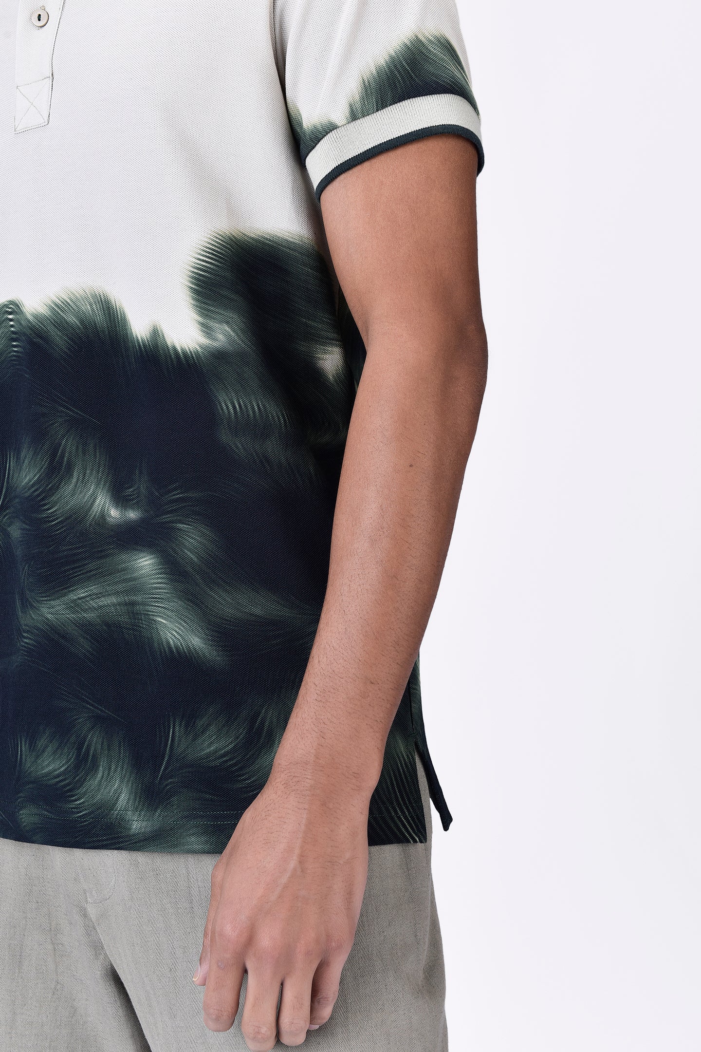 Regular fit cotton pique polo in taupe-green with UV abstract print placement and contrast collar and cuff piping for a modern touch.