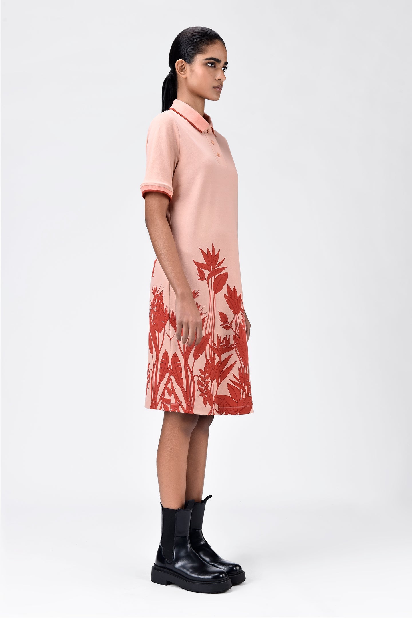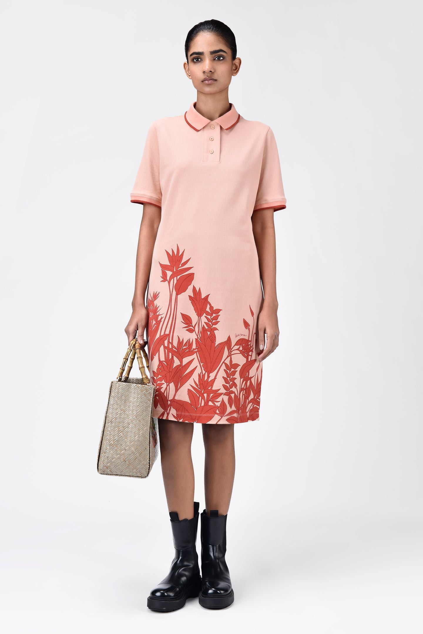 Tropical Print Polo Dress with Contrast Tipping-Light Peach