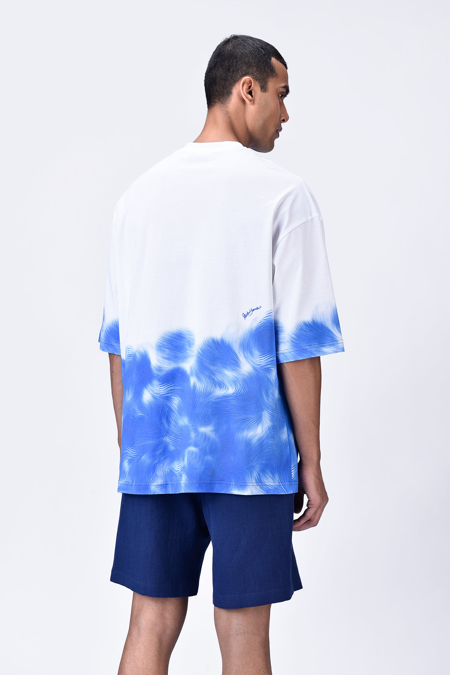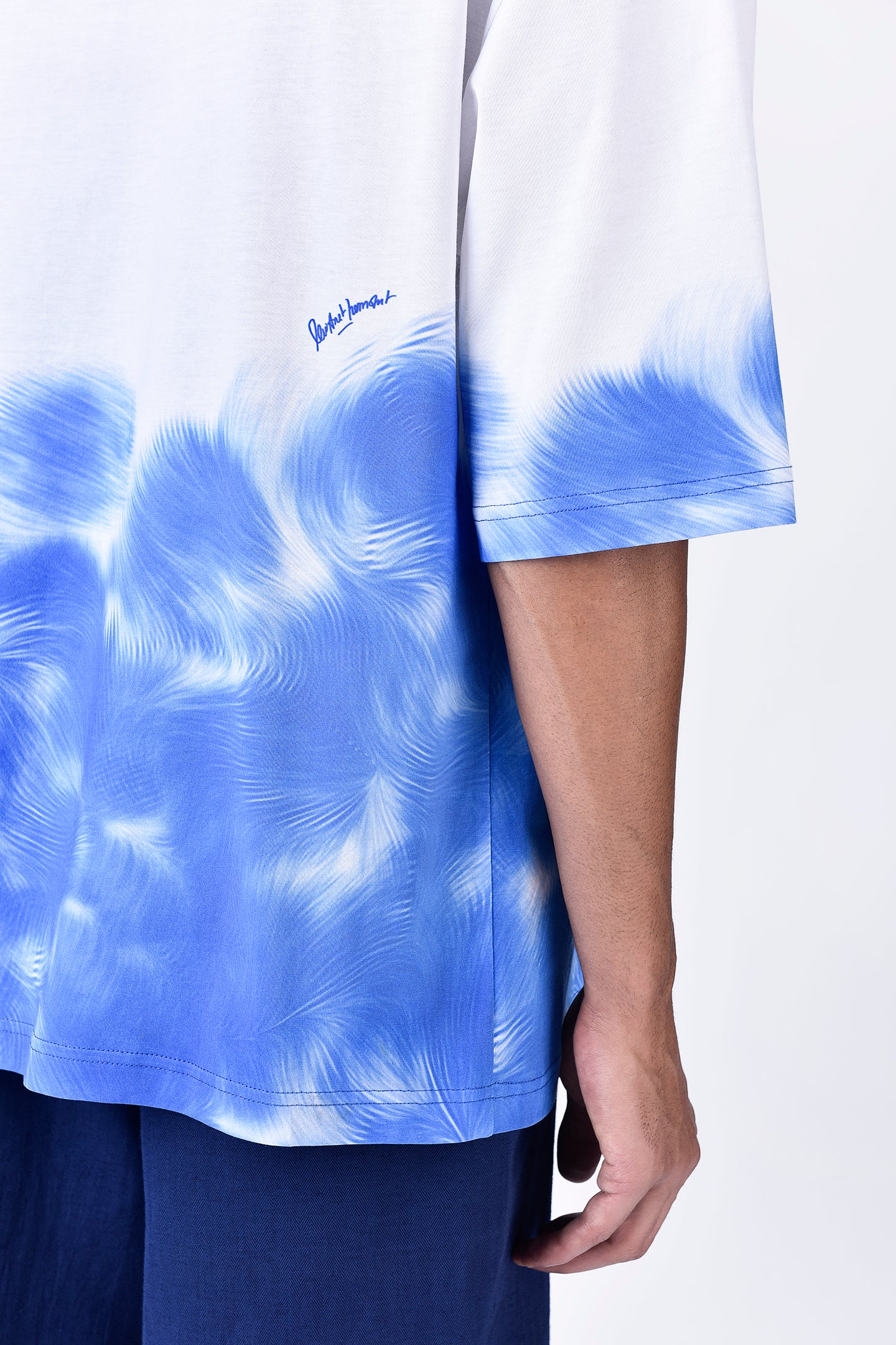 White-Blue Cotton Jersey Oversized T-Shirt with UV Abstract Print
