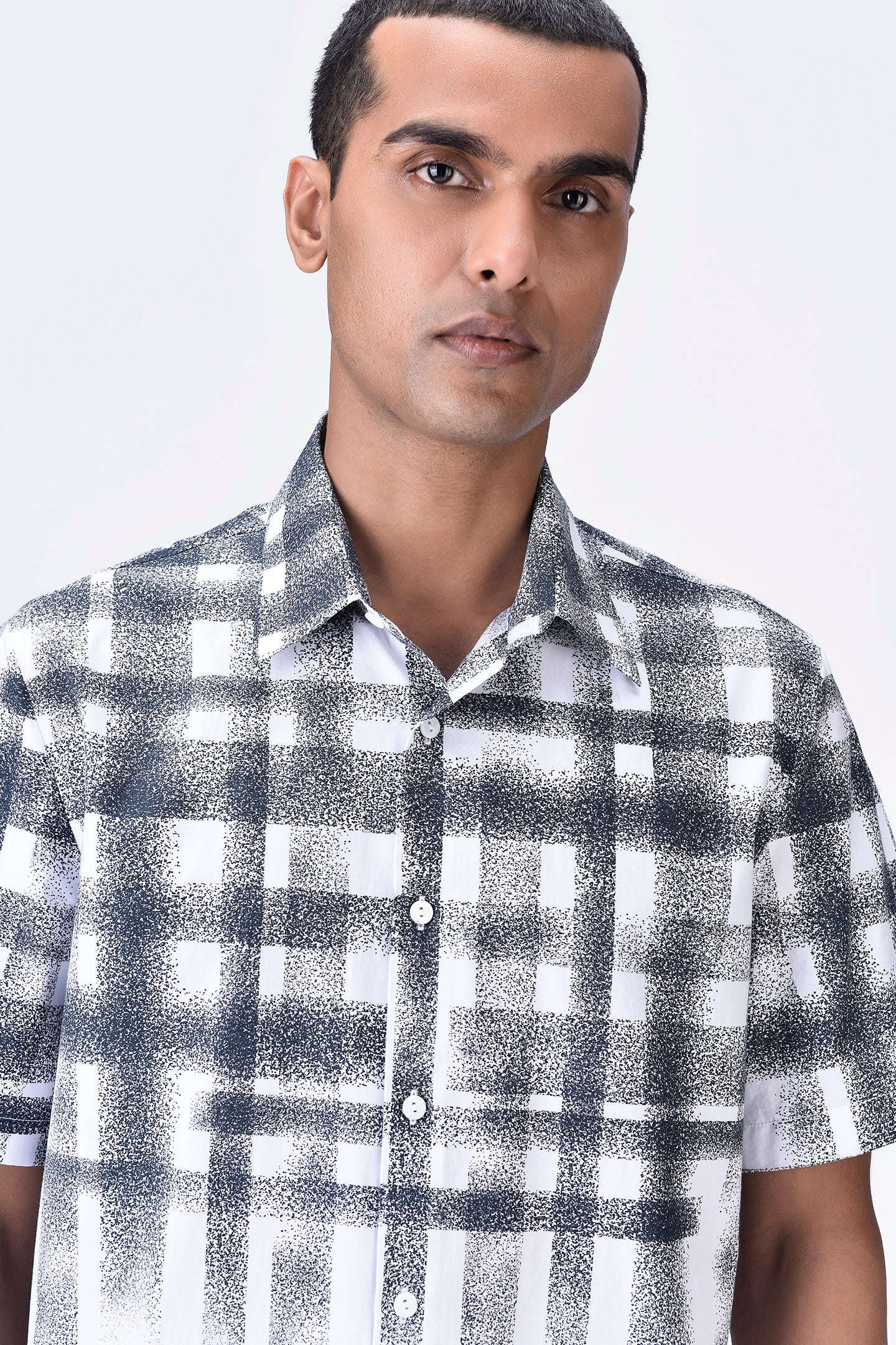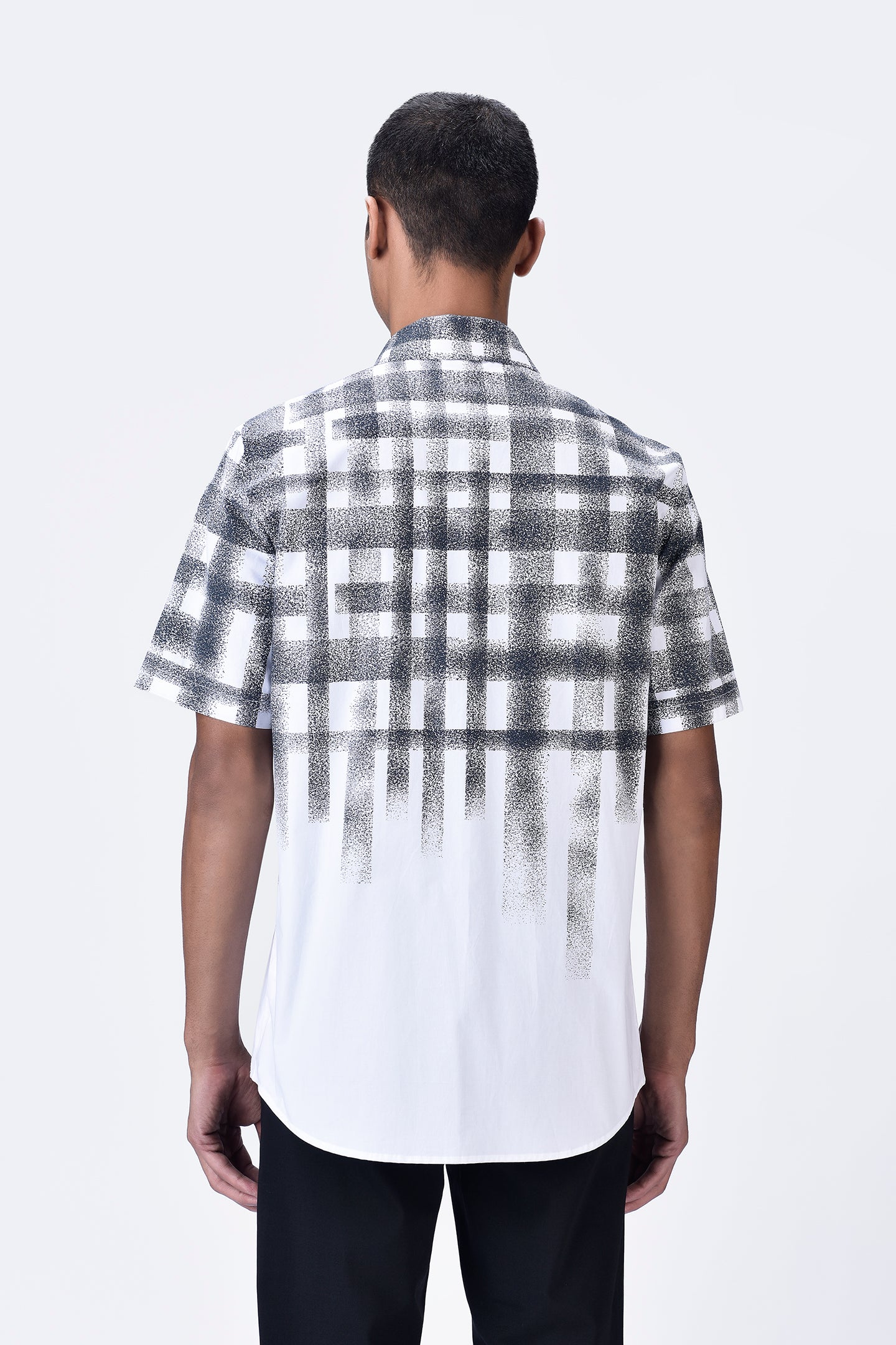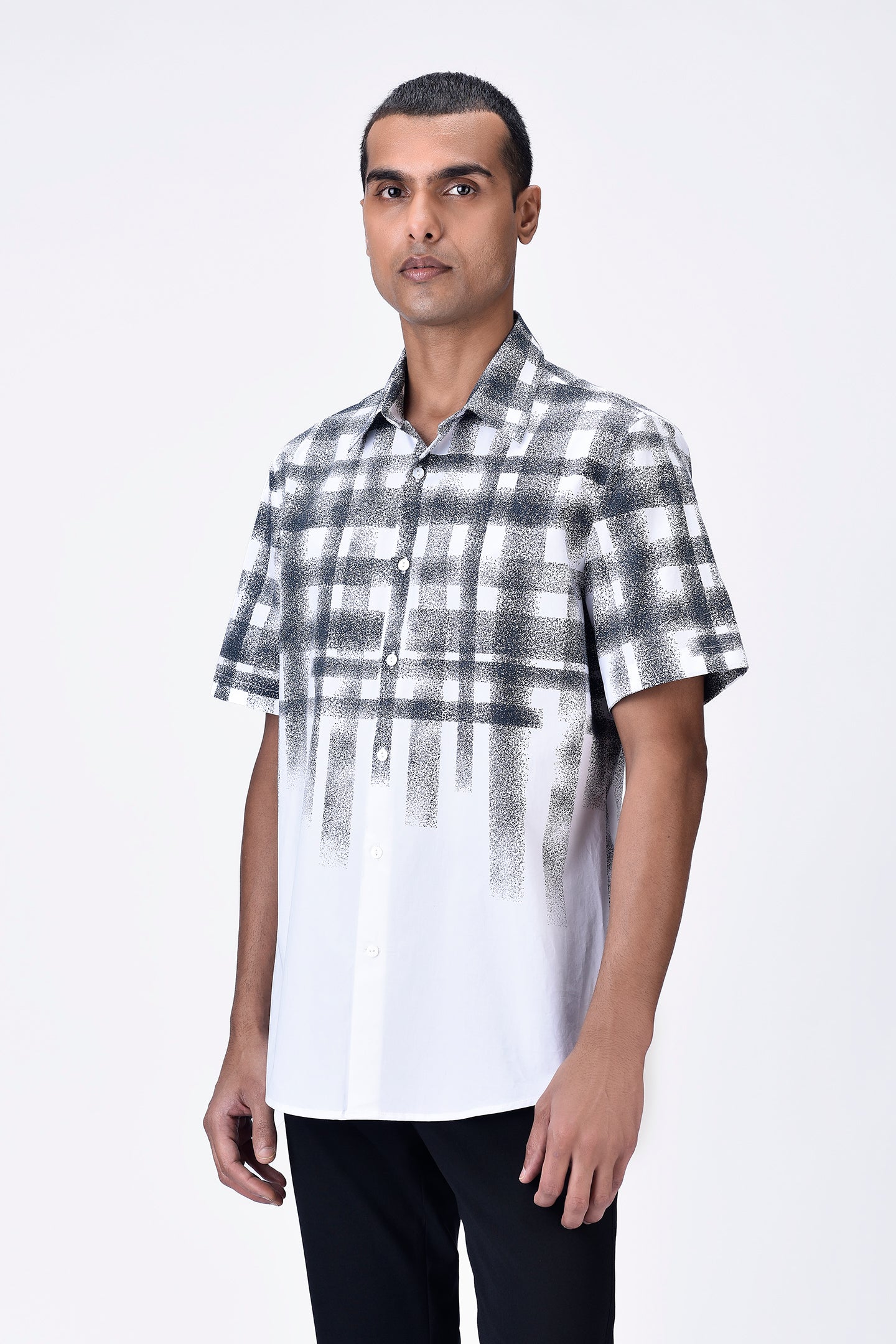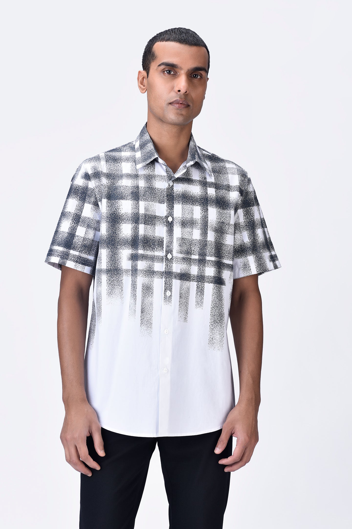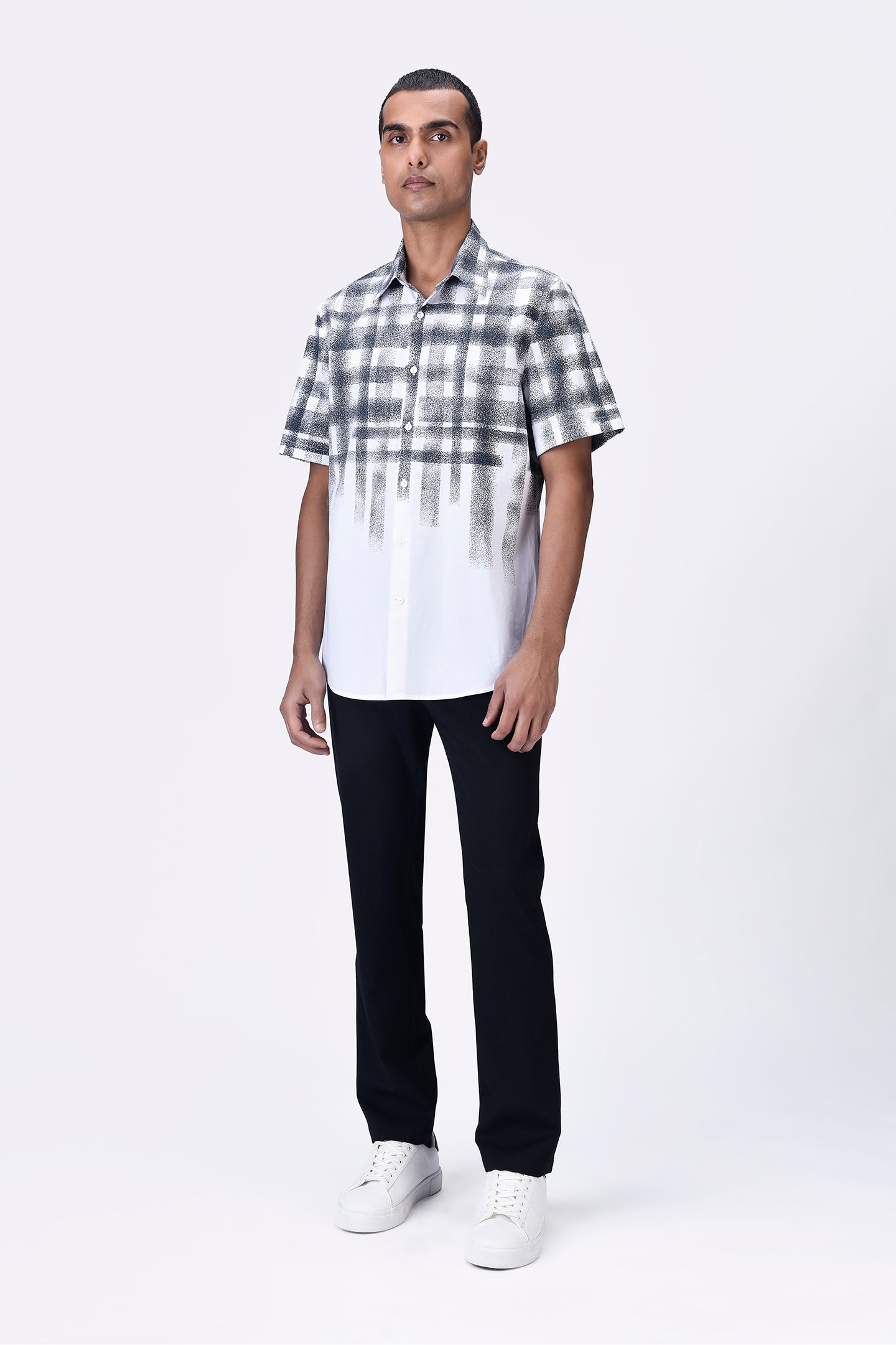 Regular fit half sleeve shirt in white Giza cotton poplin, featuring a dotted check print for a fresh, casual style.