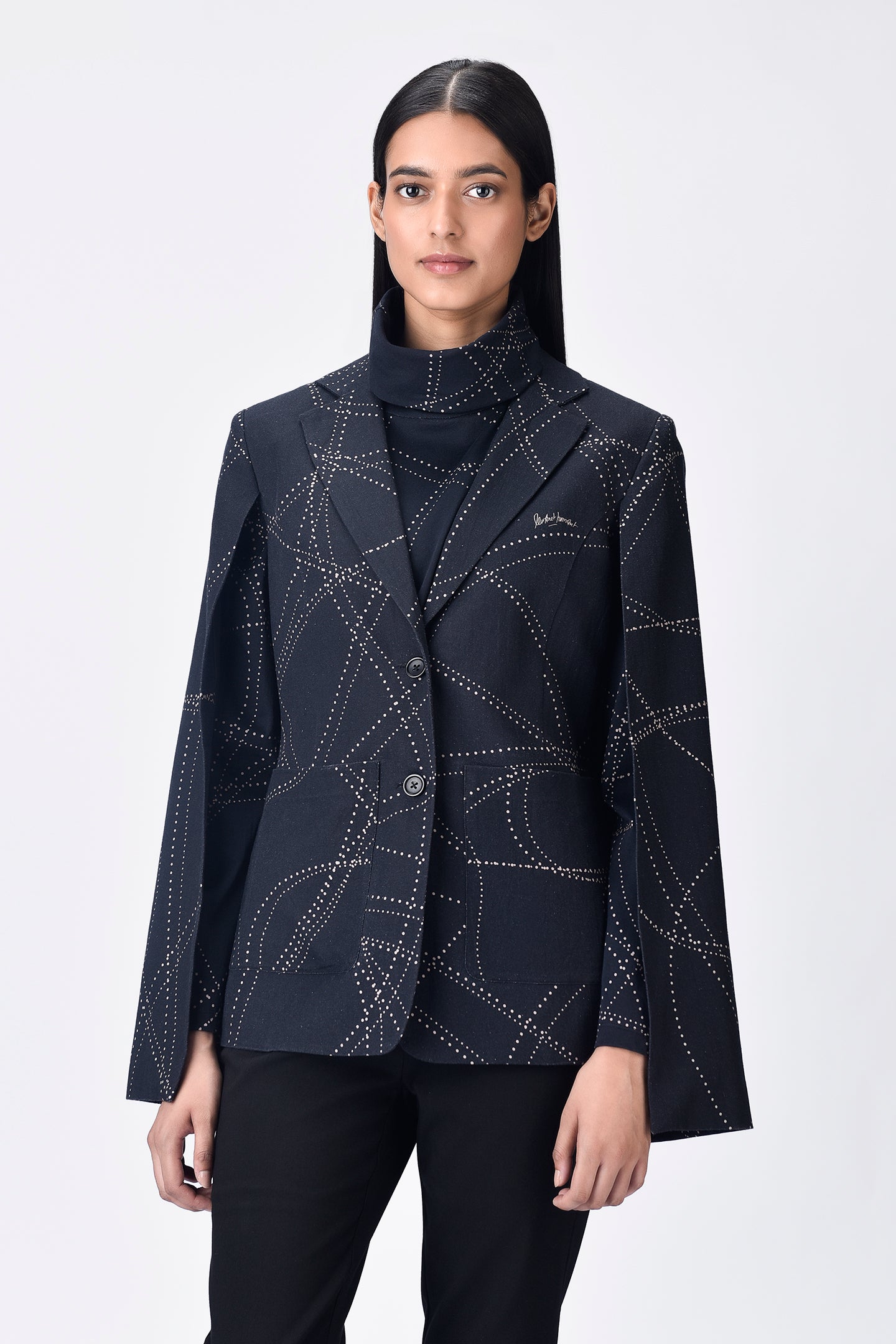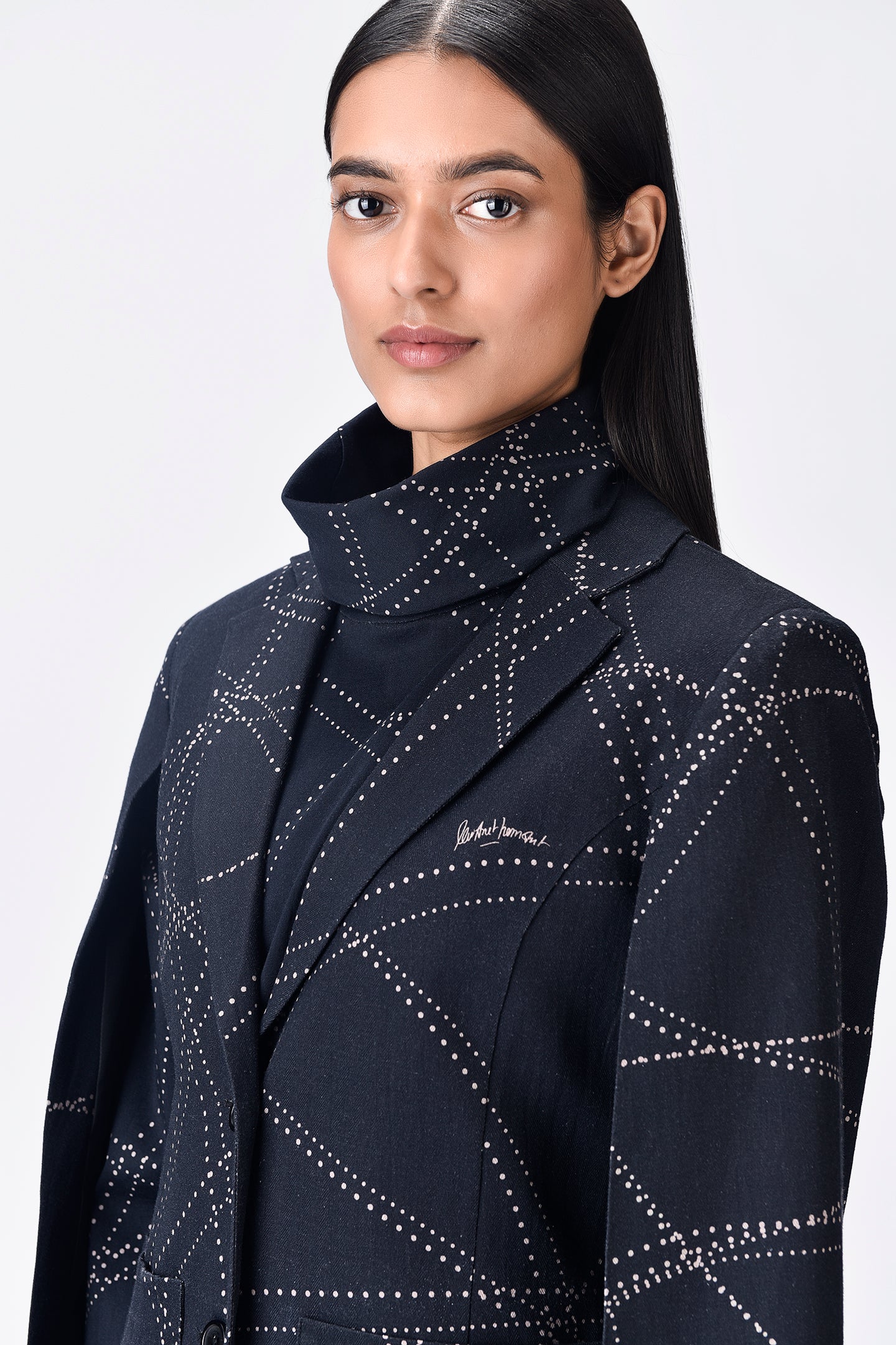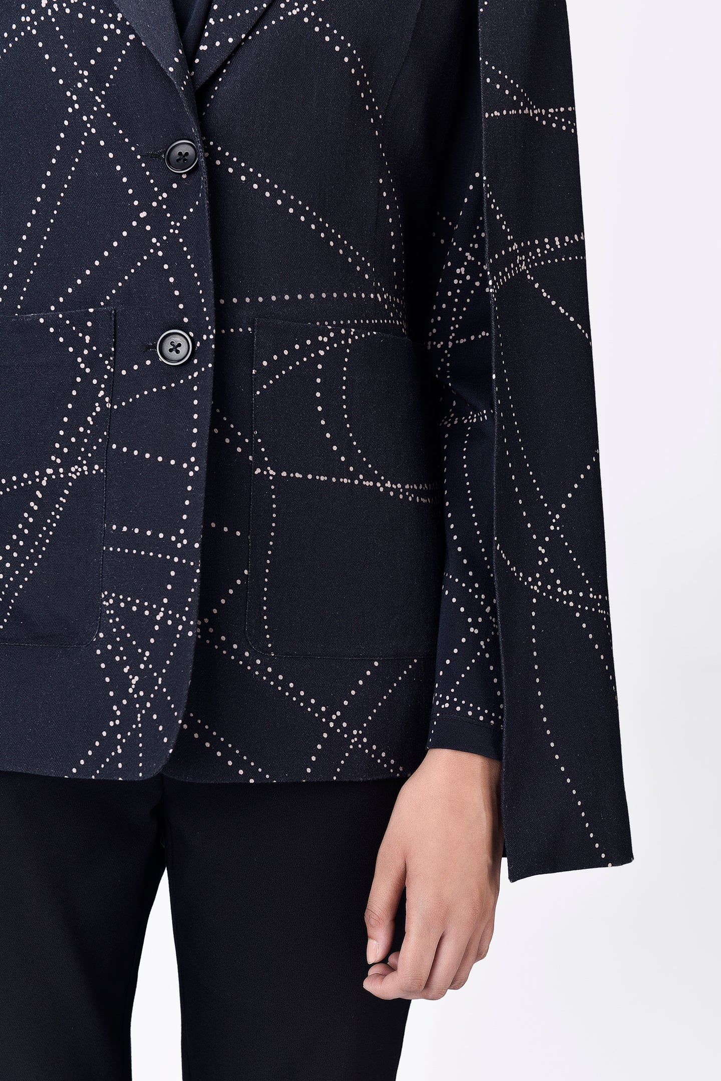 Featuring regular fit two-button blazer inspired by the cosmic energy, rendered in delicate curves of dotted display. A sophisticated piece with a modern, stylish twist.