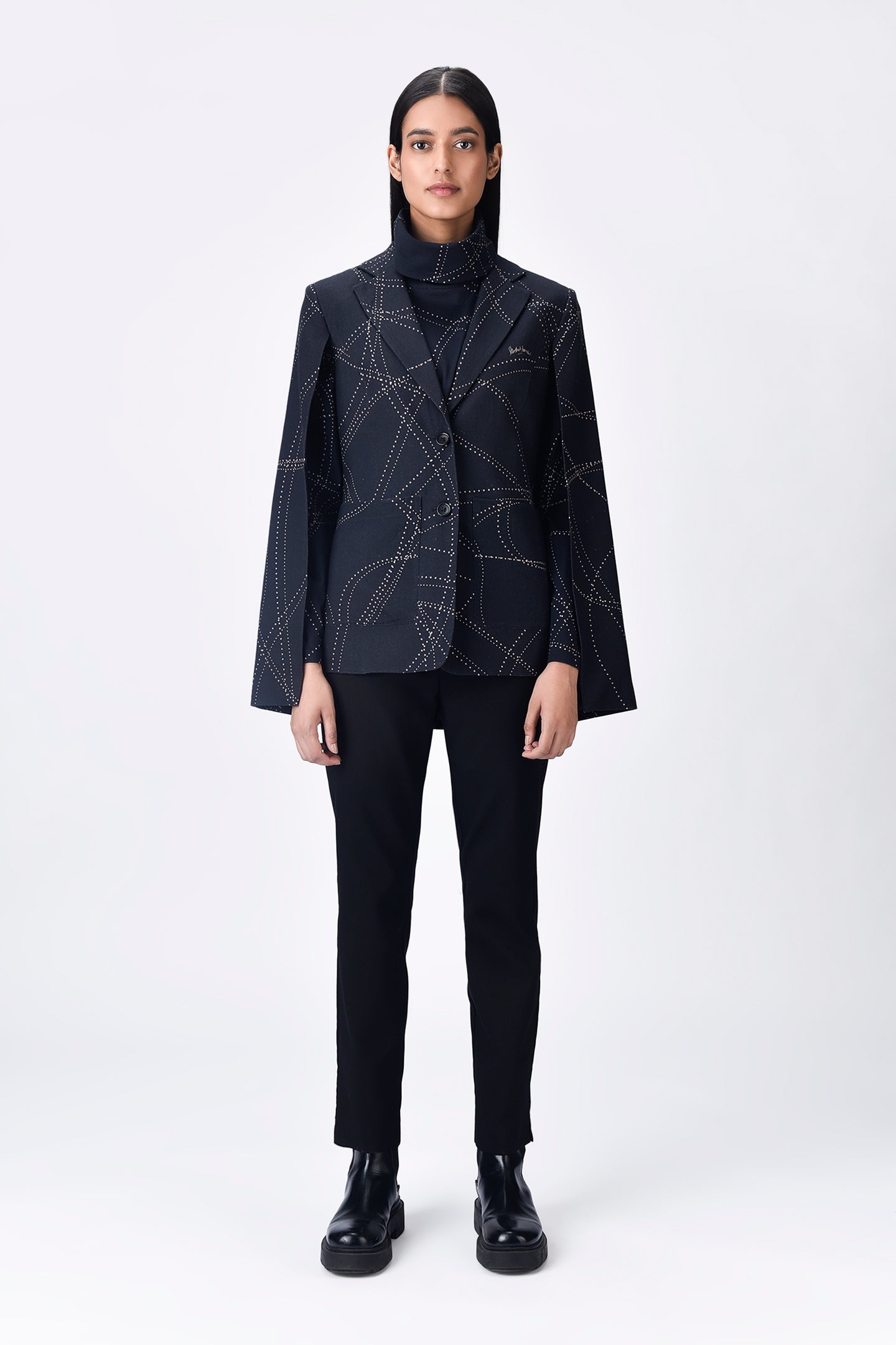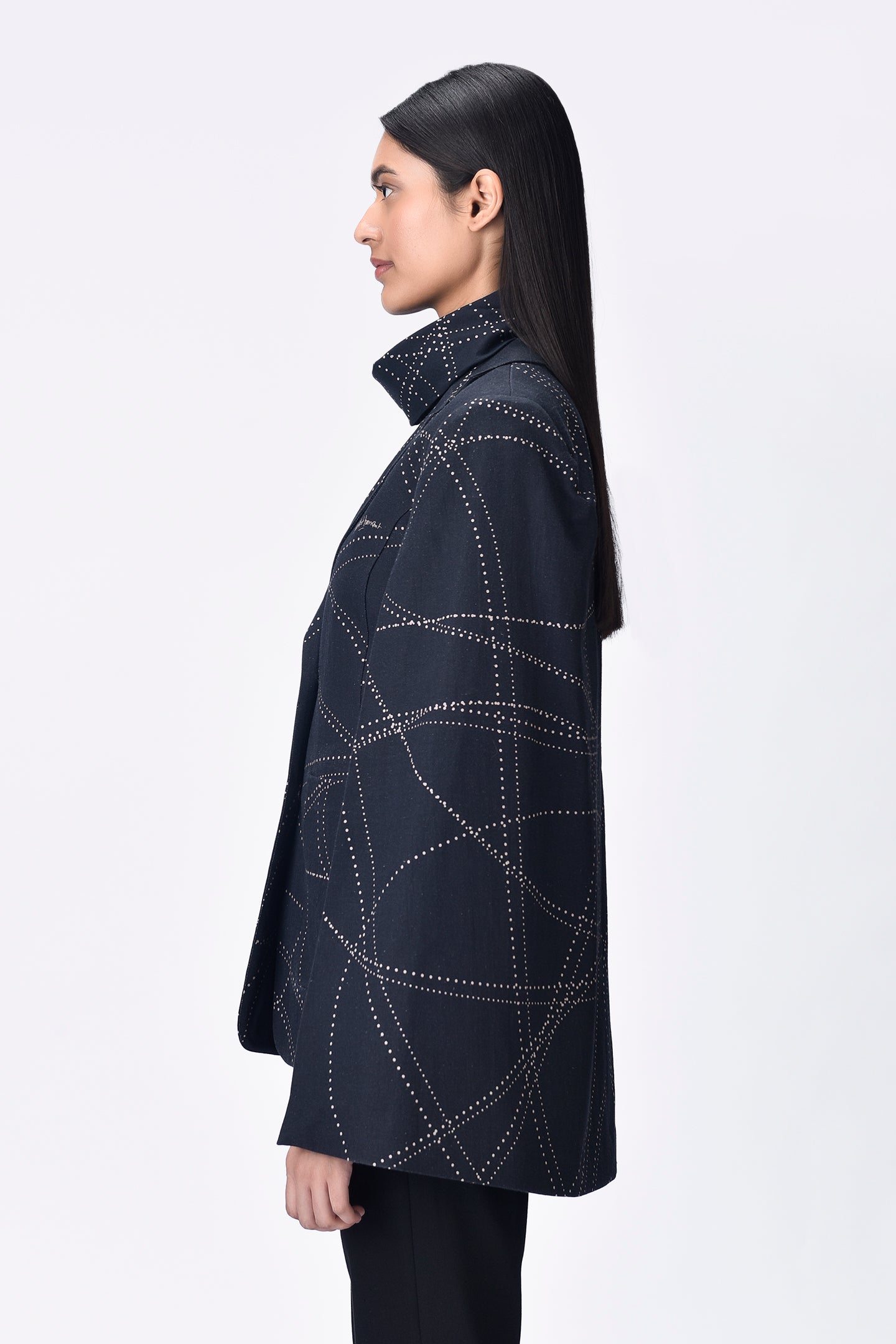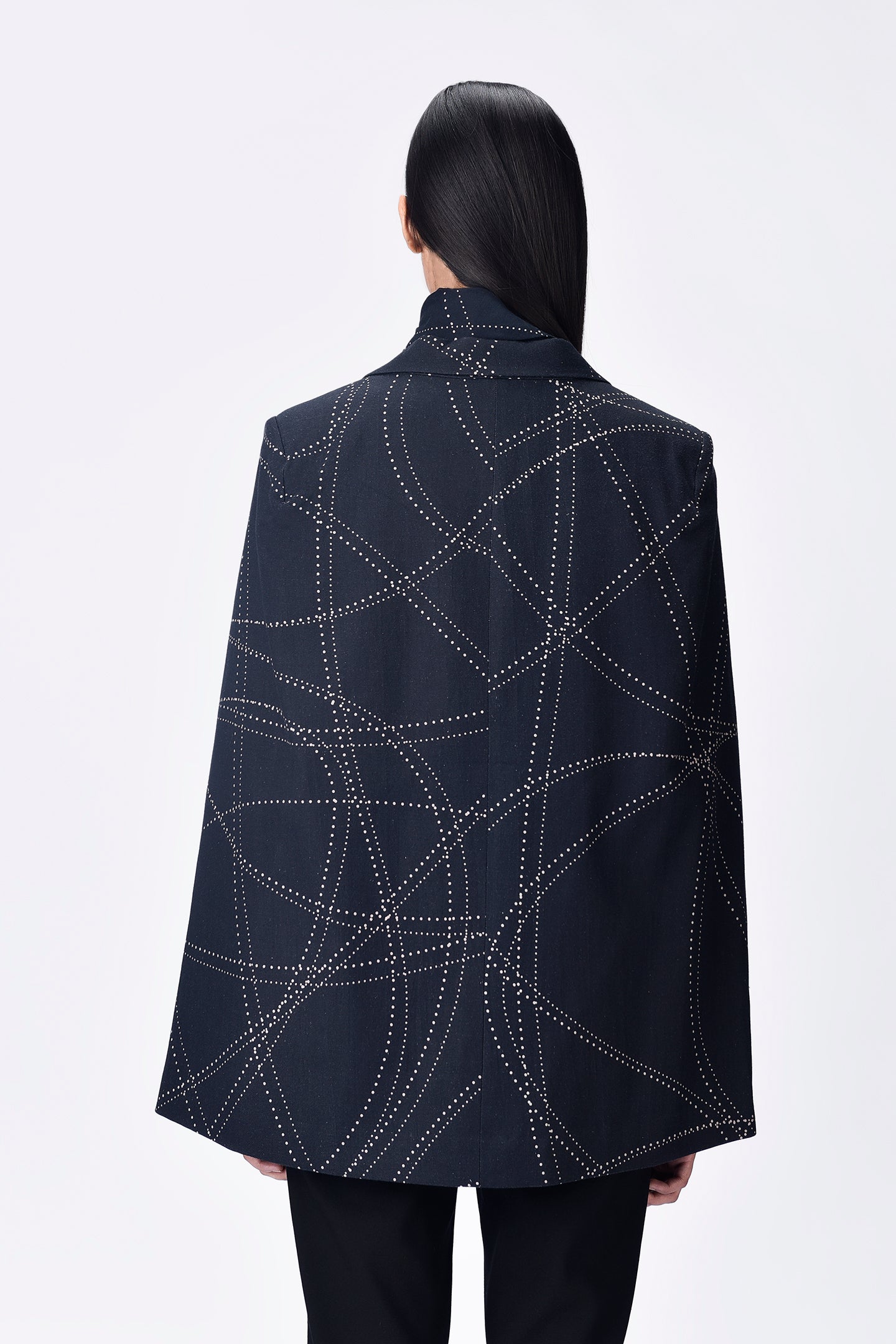 Featuring regular fit two-button blazer inspired by the cosmic energy, rendered in delicate curves of dotted display. A sophisticated piece with a modern, stylish twist.