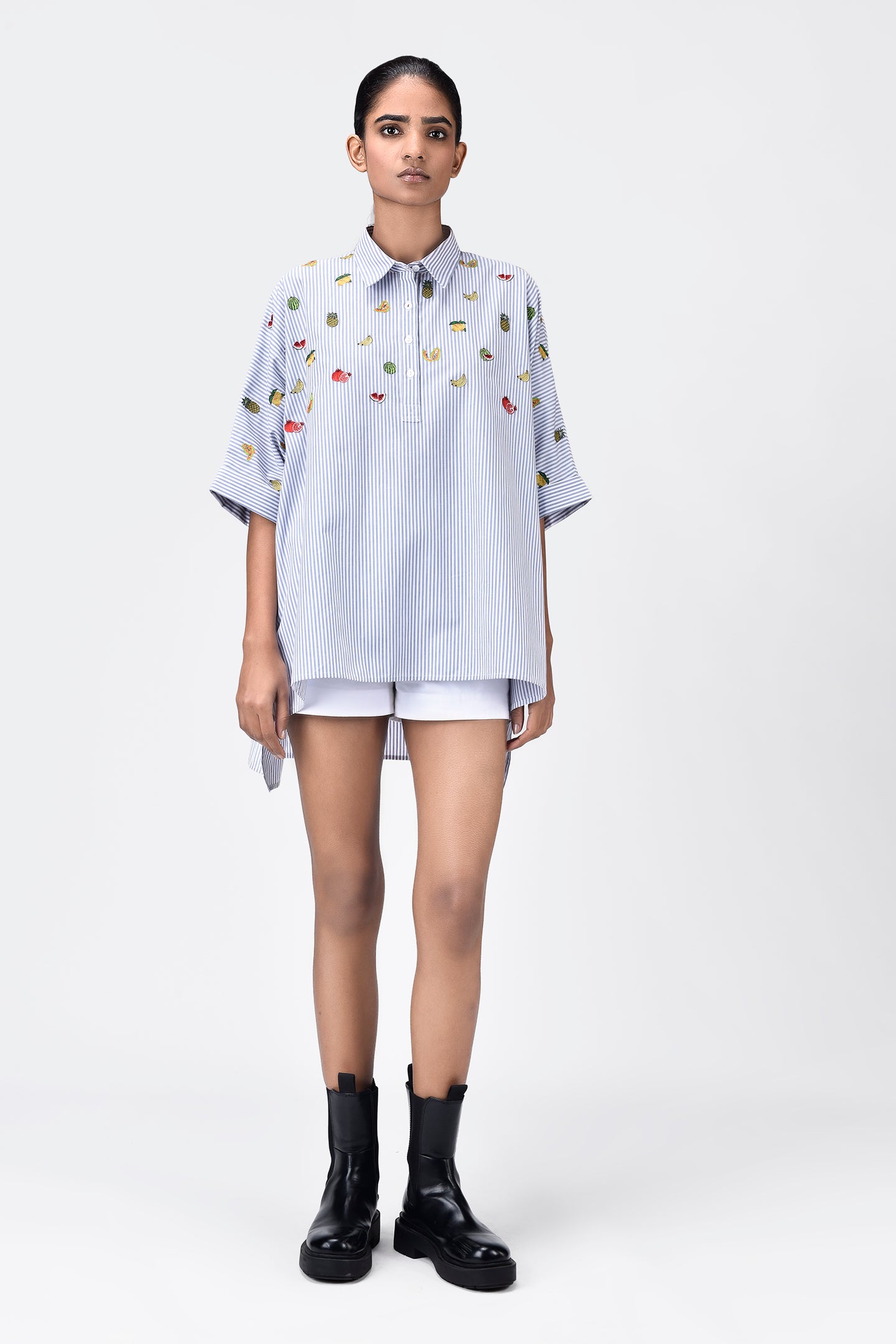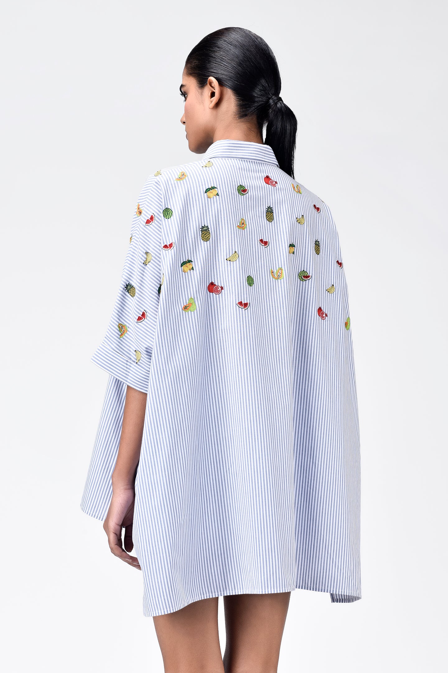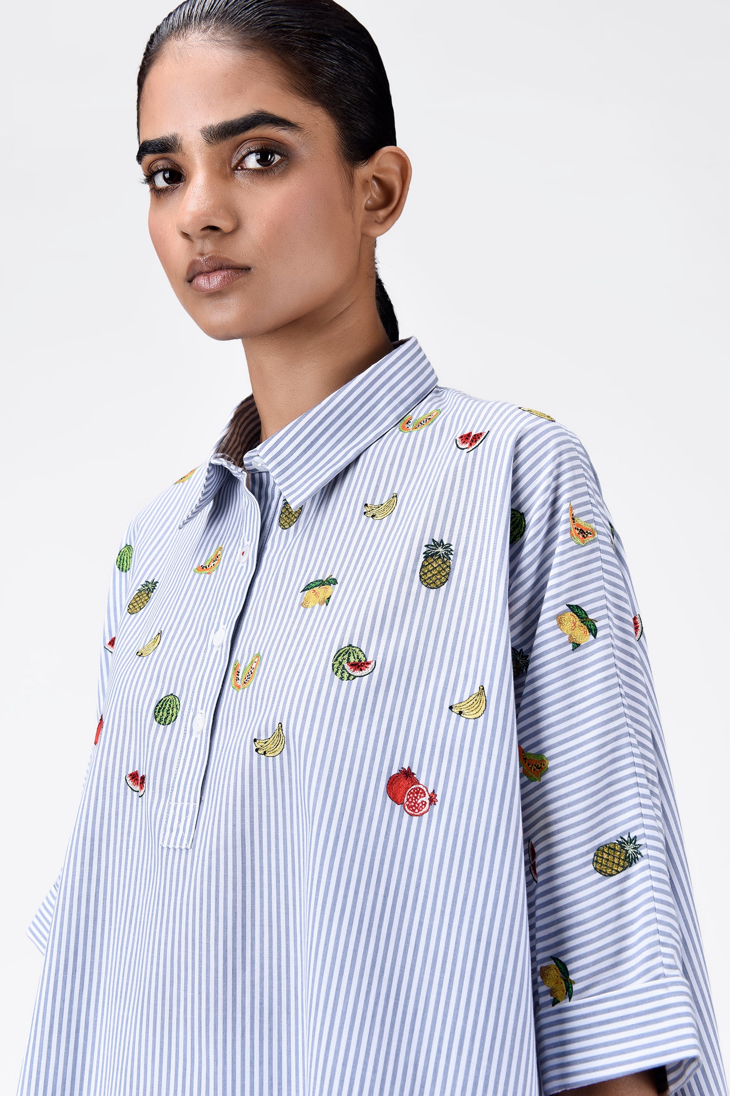 Step into a blend of comfort and playful style with our oversized striped shirt, tailored from soft cotton fabric. This unique piece captivates with mixed fruit motifs embroidery, adding a whimsical touch to the classic stripes.