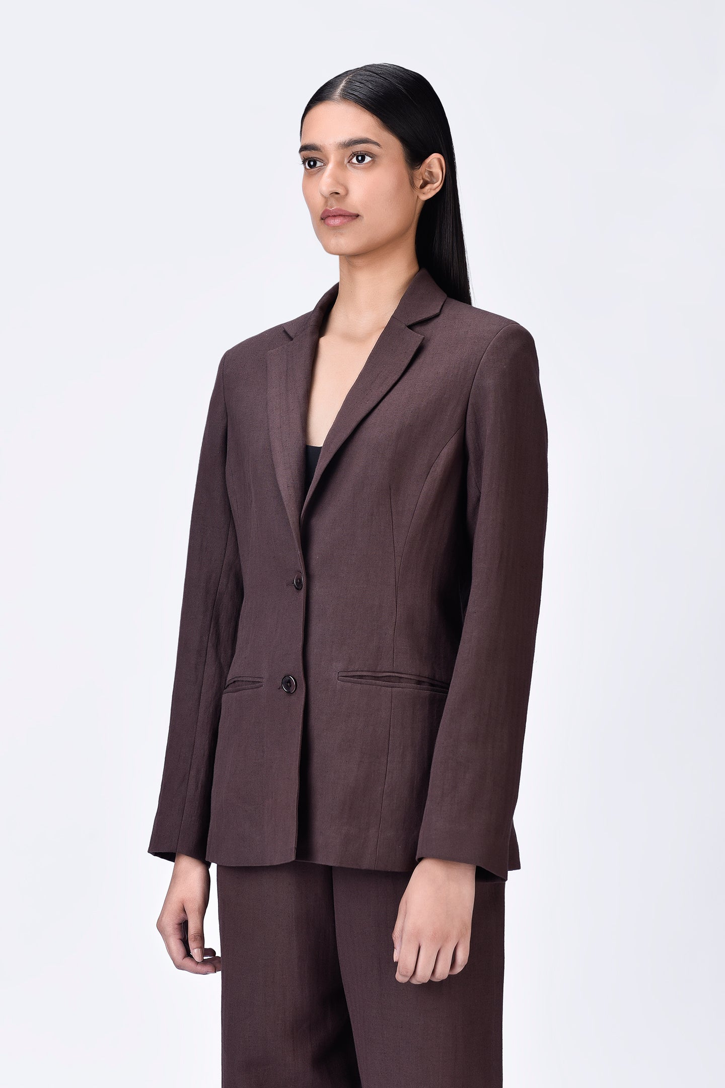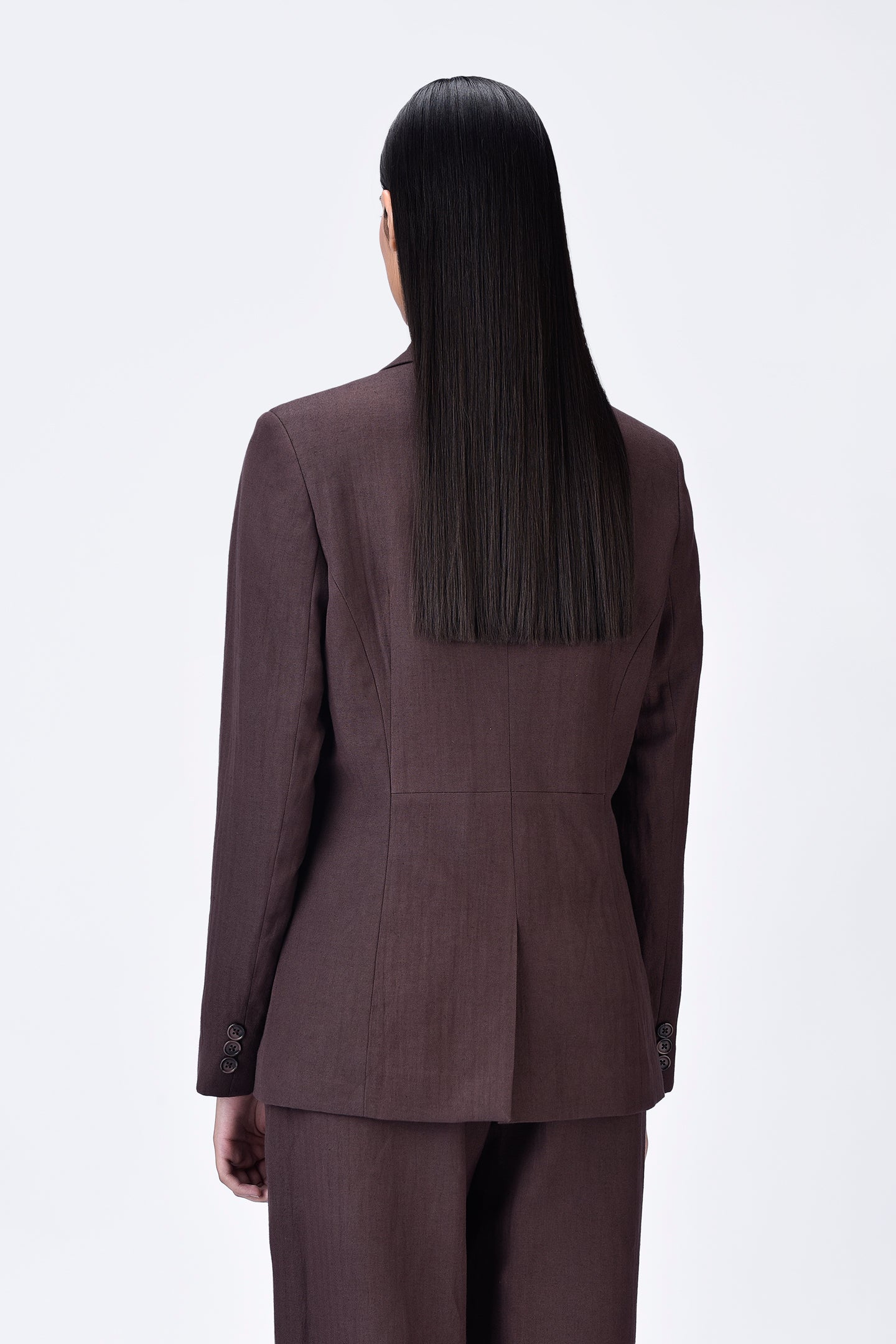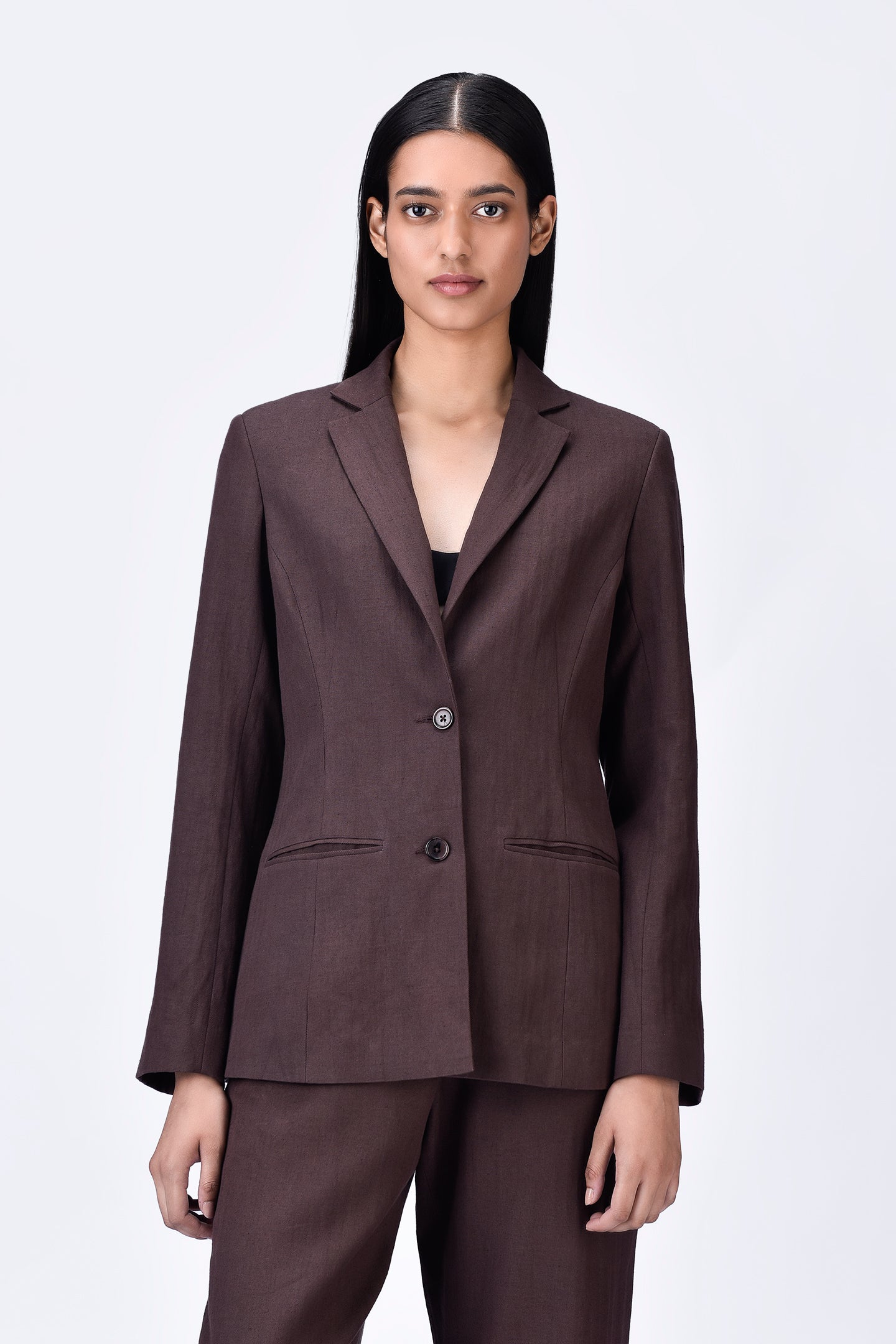 Featuring Semi-Fitted Linen Jacket with constructed darts delivering a tailored and refined look, perfect for both professional and casual setting.