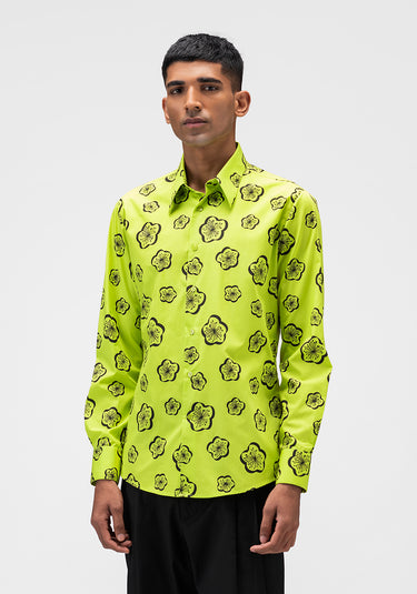 A play of 3D floral print appears on this regular fit button down shirt for men. Cut in black cotton poplin, it features contrasting white floral print.