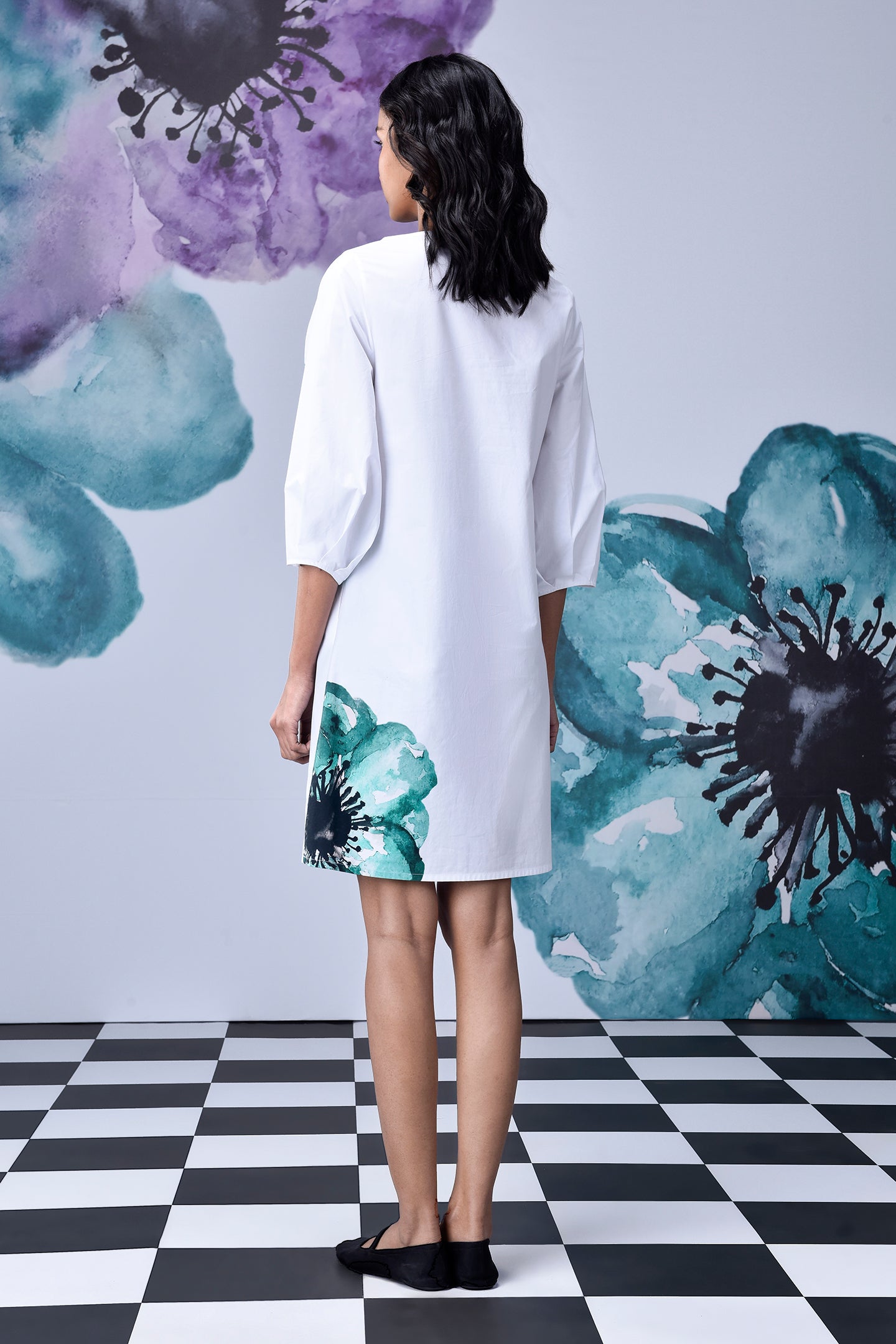 Presenting a smart casual Anemone Flower Dress in White Green, inspired by larger than life Anemone flowers and the dreamy florals of Lewis Carroll’s Alice in Wonderland. Perfect for making a romantic lunch or day-out.