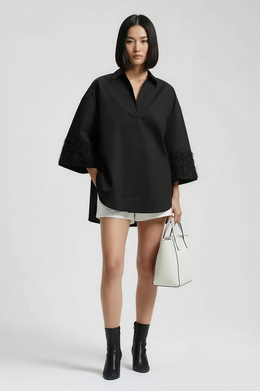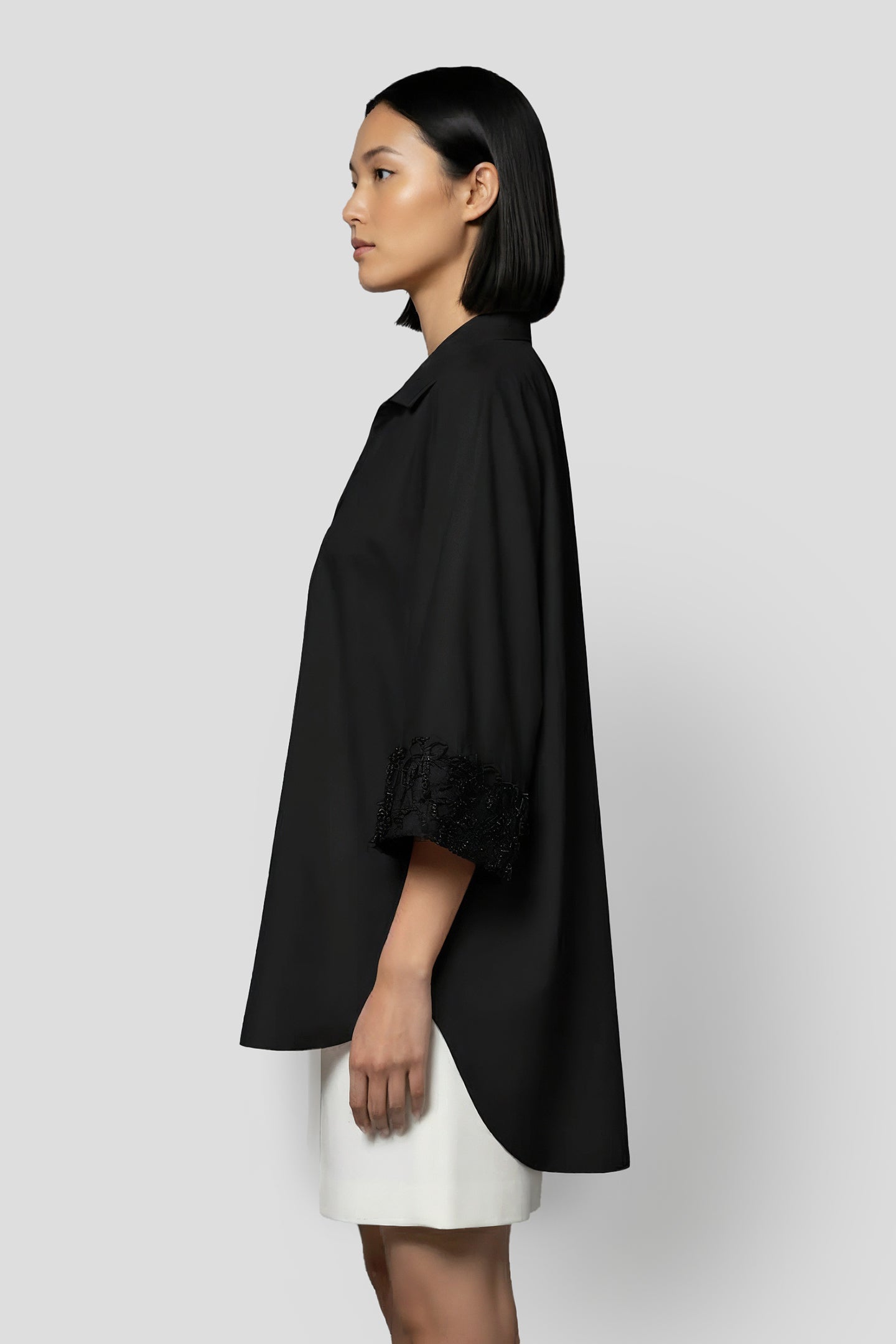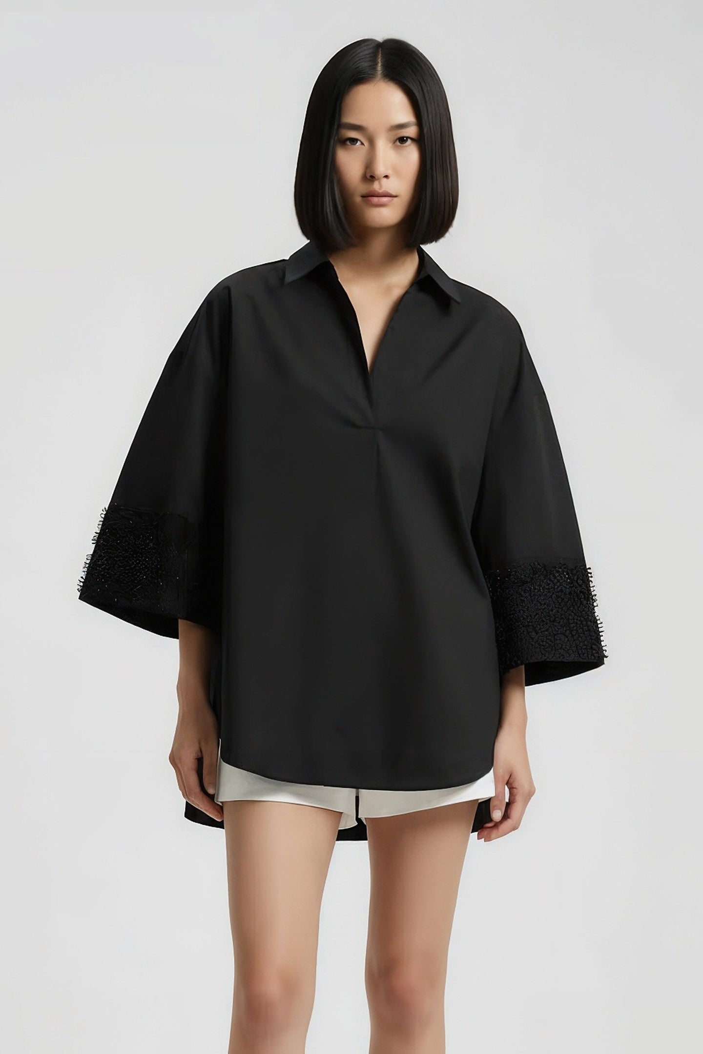 Cut in a relaxed fit, the shirt features a clean V-neckline with a hidden placket and dropped shoulders that enhance its effortless drape.