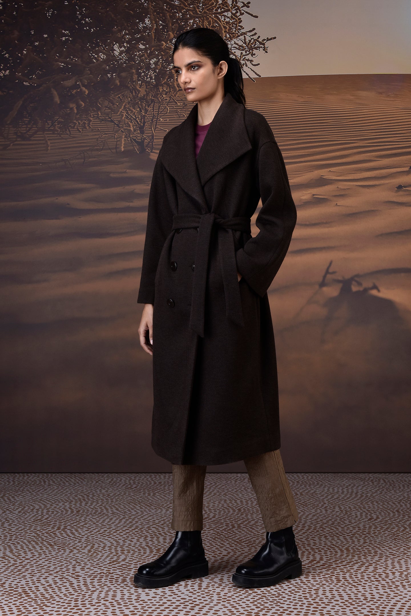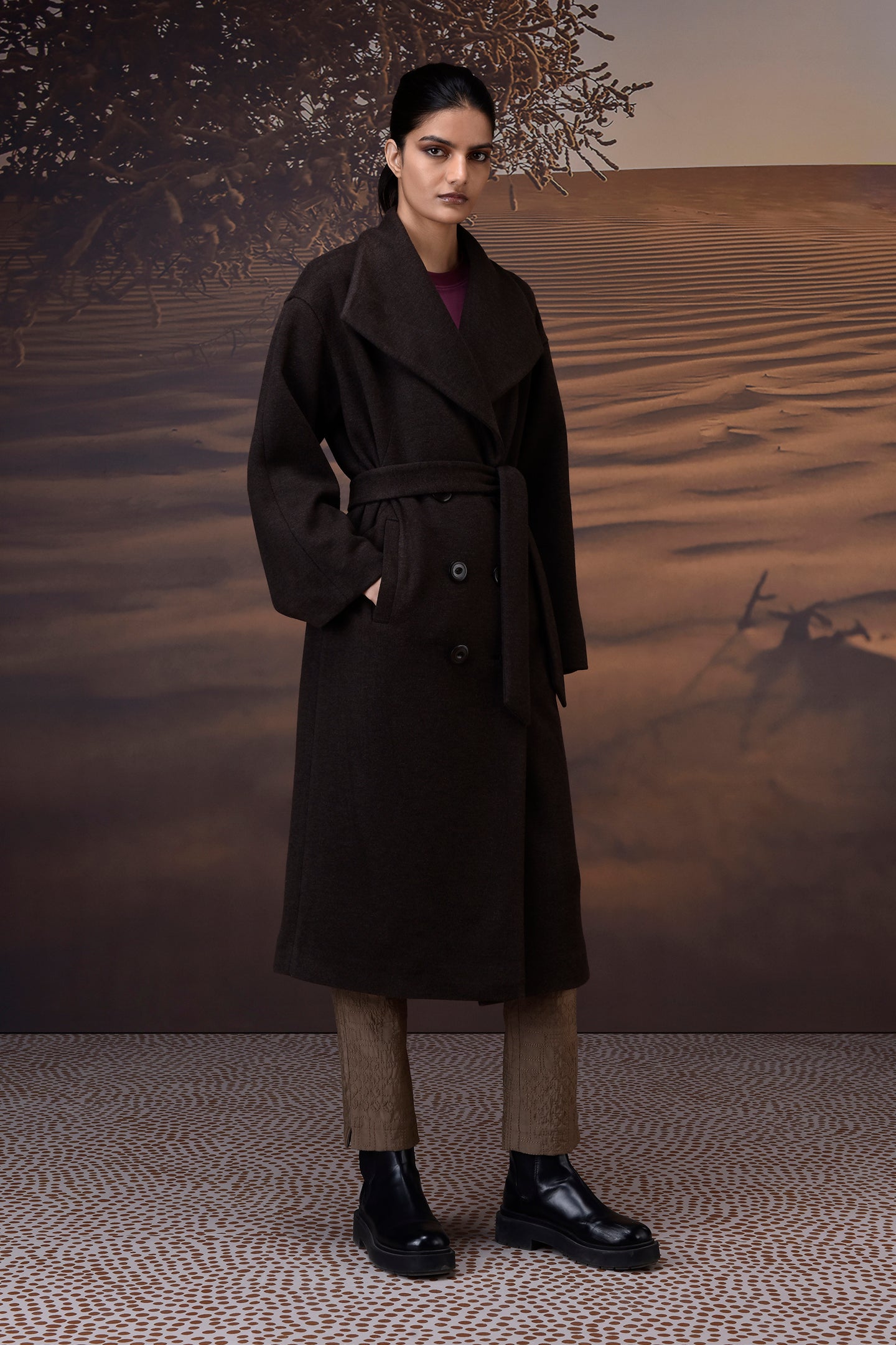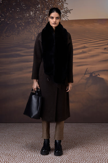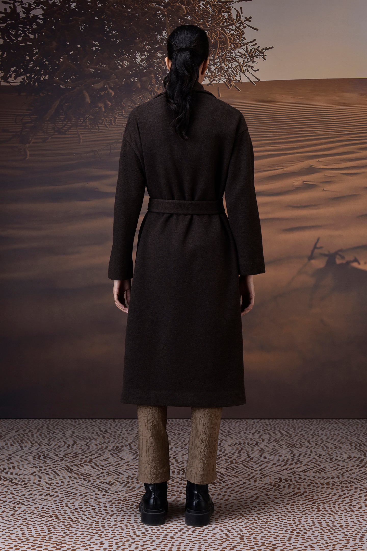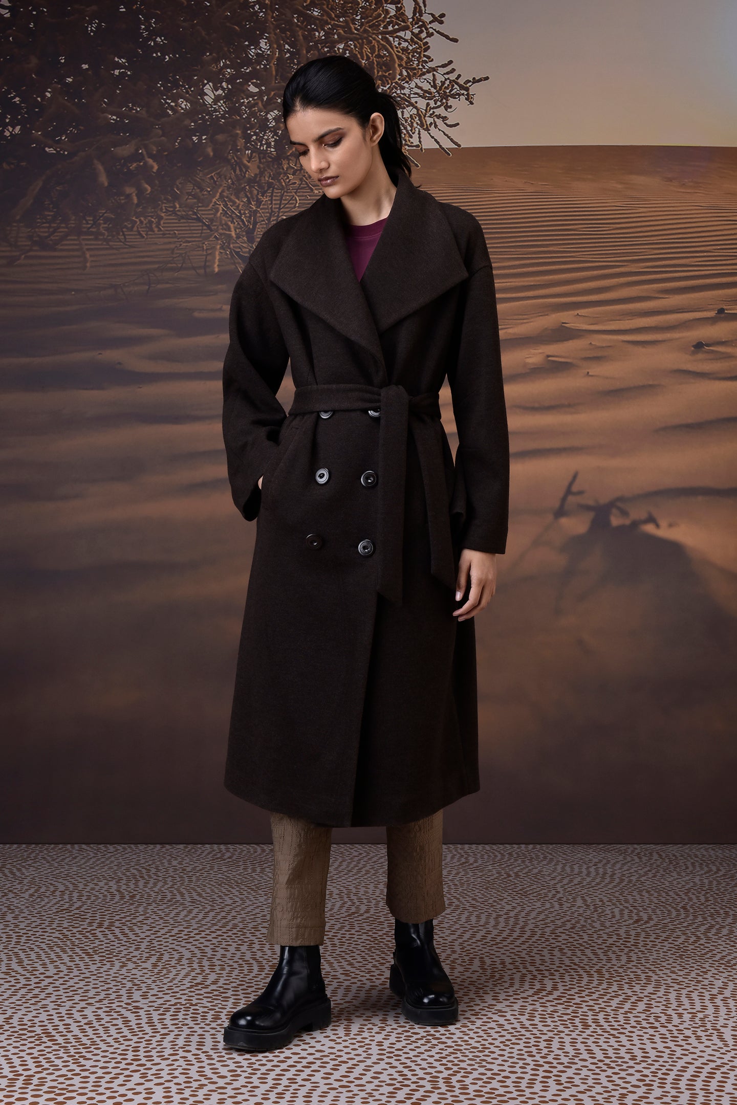 Crafted in sumptuous double-layer fleece, this chocolate brown overcoat combines warmth, structure, and timeless elegance. Its wrap-style front is enhanced with a wide lapel collar and a matching self-tie belt, creating a flattering silhouette while ensuring comfort in cooler weather. Double-breasted buttons add a refined touch, while the mid-calf length provides versatile styling for day-to-night wear.