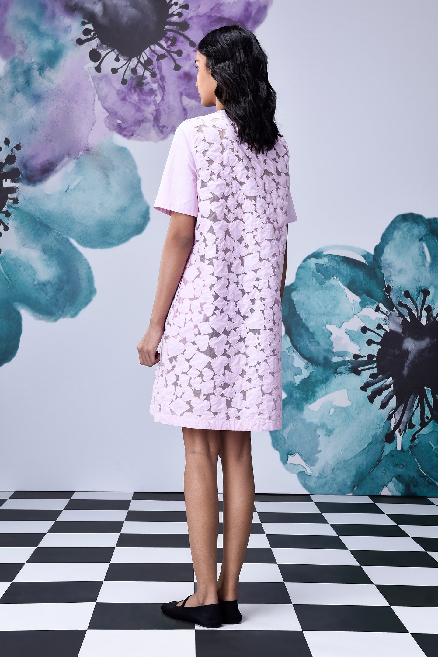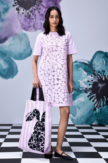 Elevate your wardrobe with our Cutout Embroidery Dress in Smoothie pink, monochromatic cut-out appliqué inspired by the motifs of playing cards is craftsmanship for modern living.