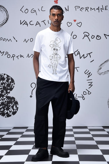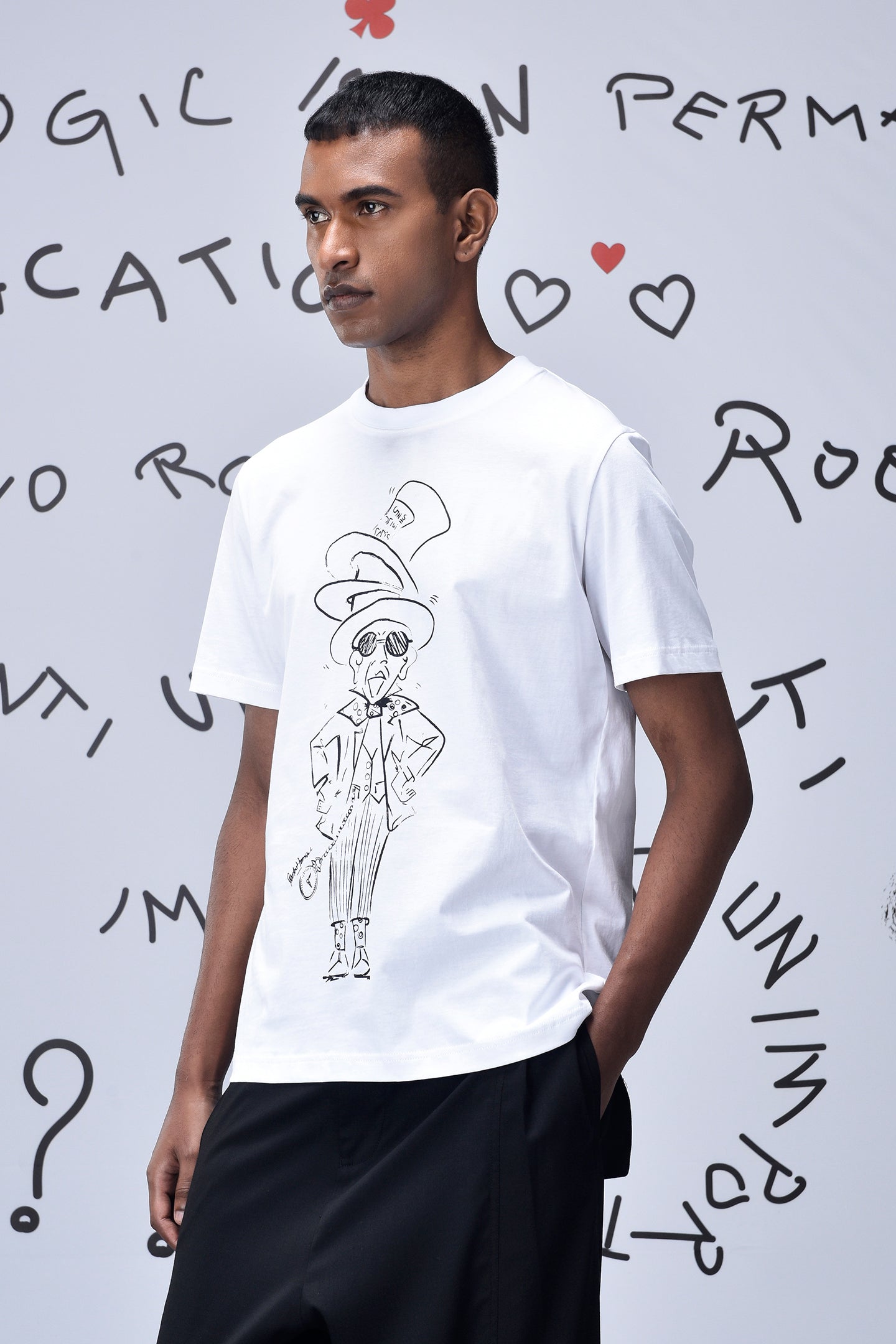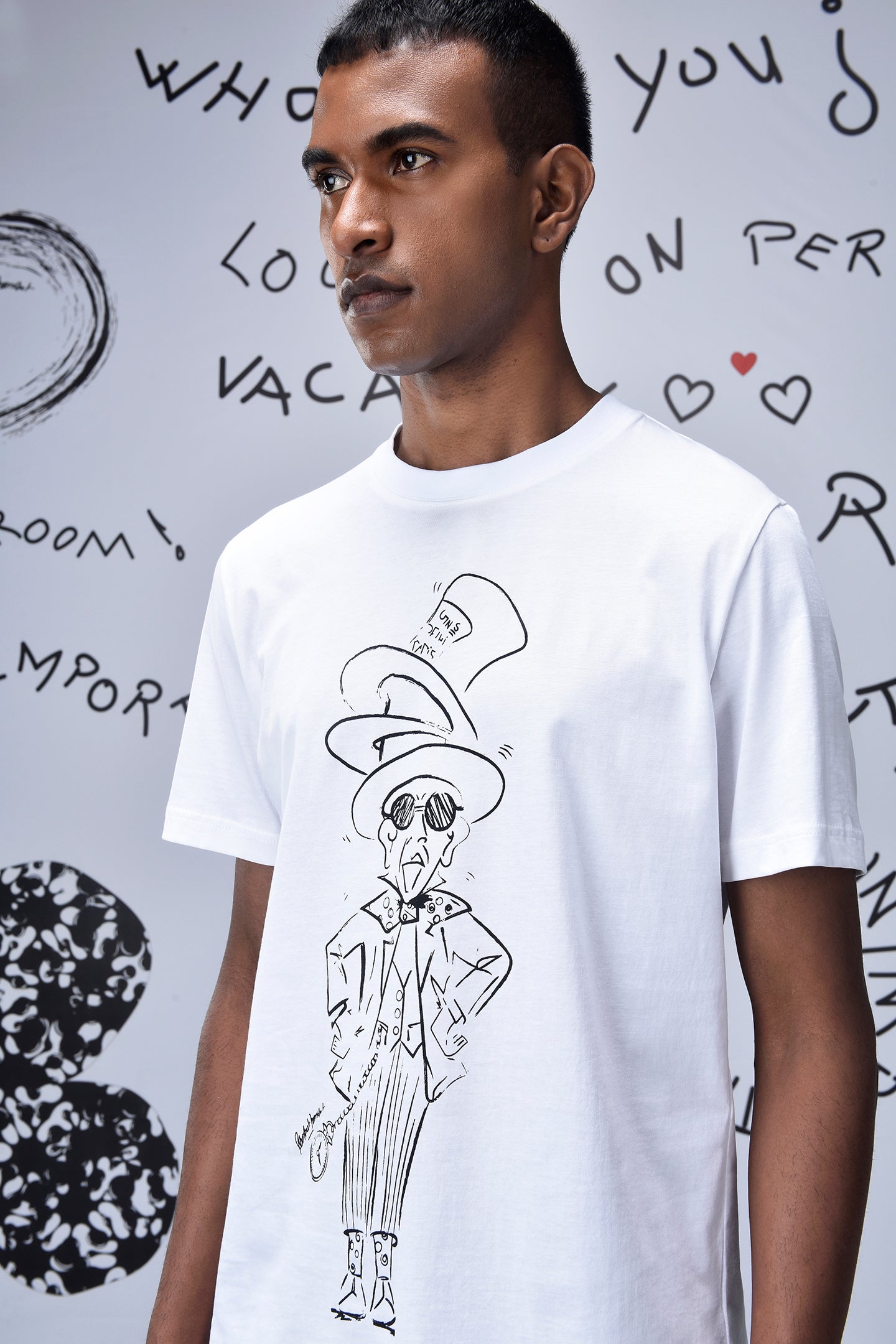 Our White Cotton Single Jersey T-Shirt merges effortless comfort with a playful artistic edge. Featuring a hand-sketched character graphic, this tee captures the label’s creative wit and modern minimalism, perfect for everyday expression.