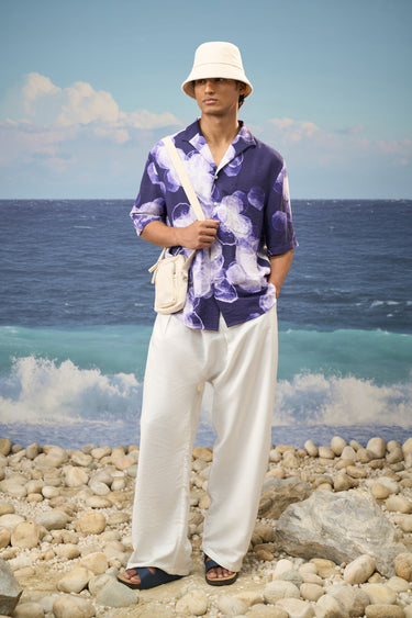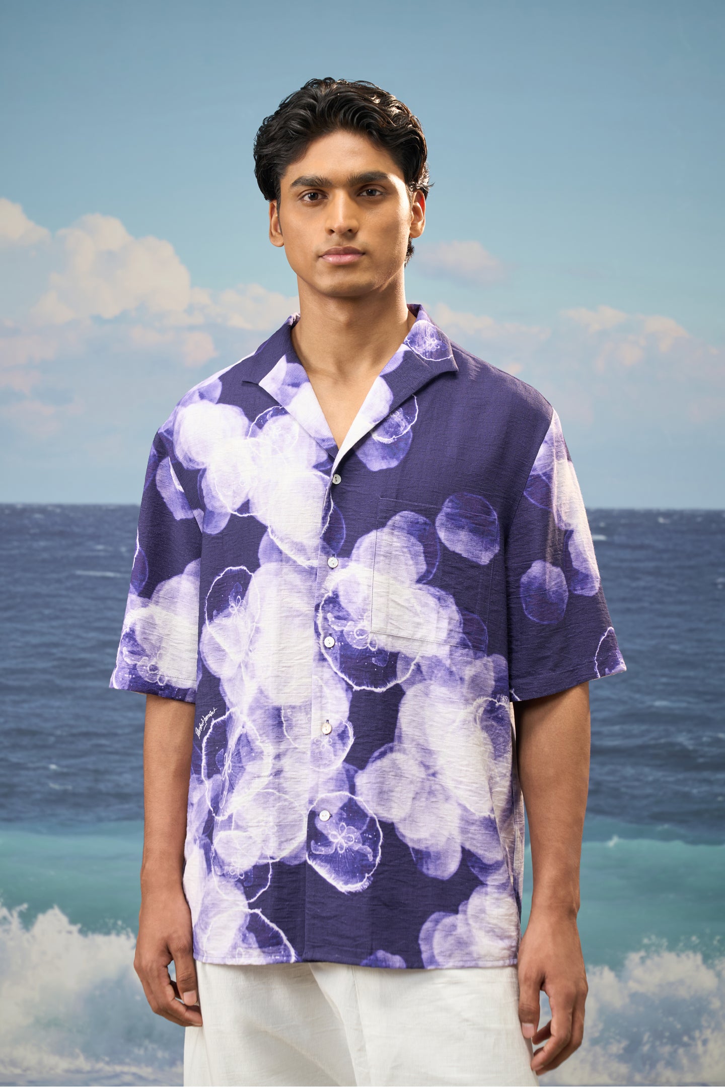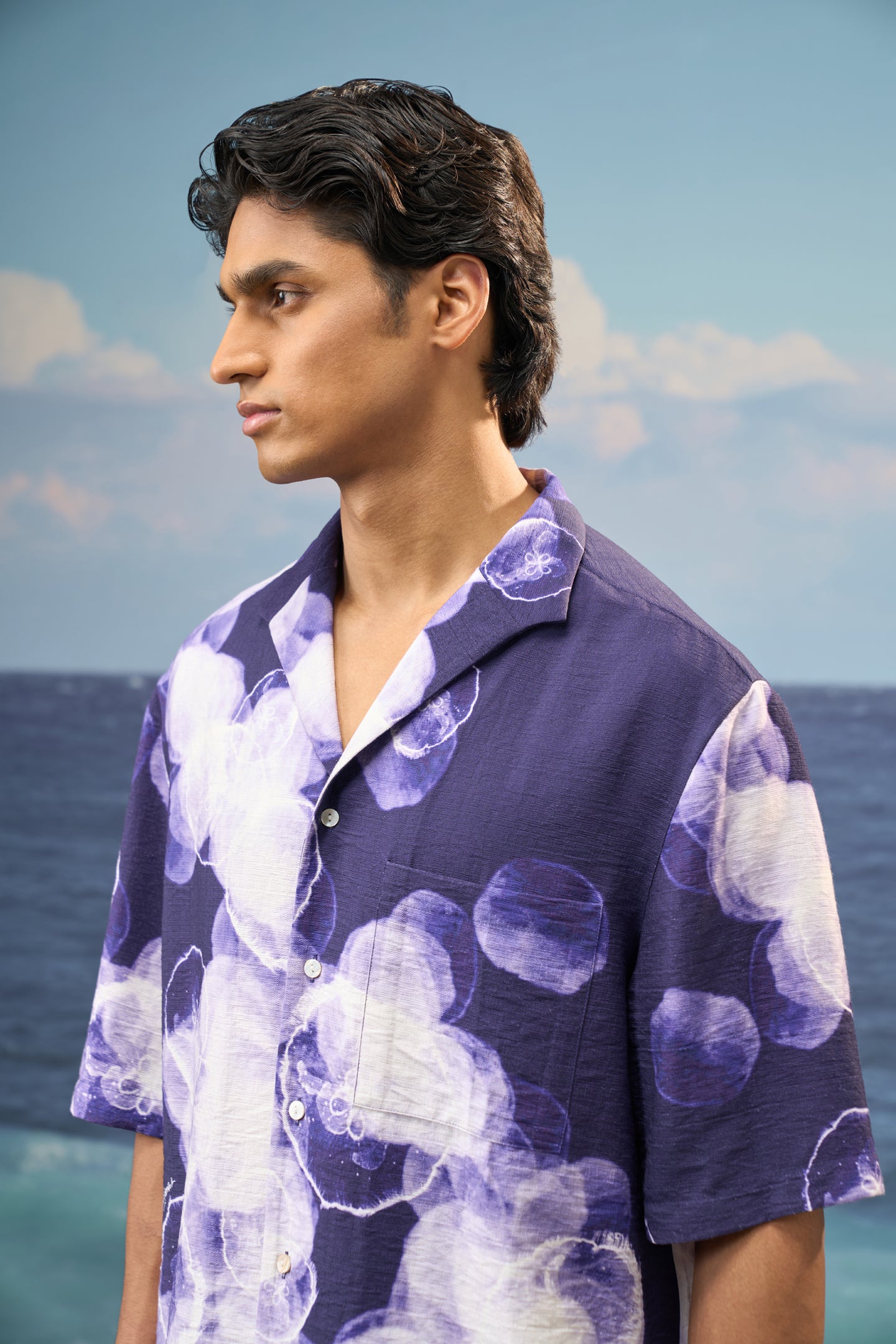 Designed in a fluid viscose–nylon blend, this shirt offers a smooth drape with a lightweight, breathable feel. Finished in a deep Navy base, the abstract cloud print creates a layered visual effect that feels both modern and relaxed. The notch lapel lends a subtle resort-inspired character, giving the piece a polished yet effortless presence.