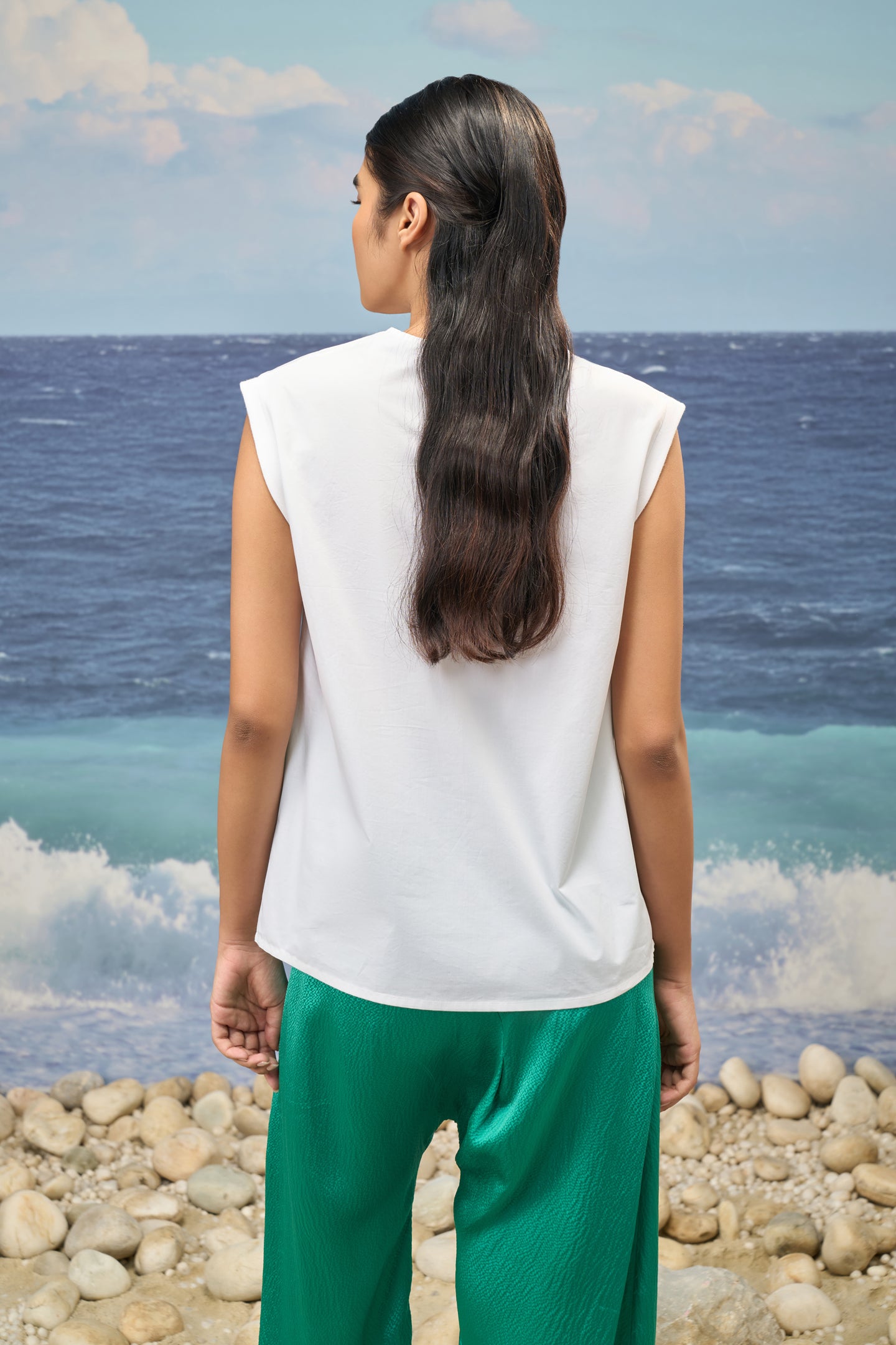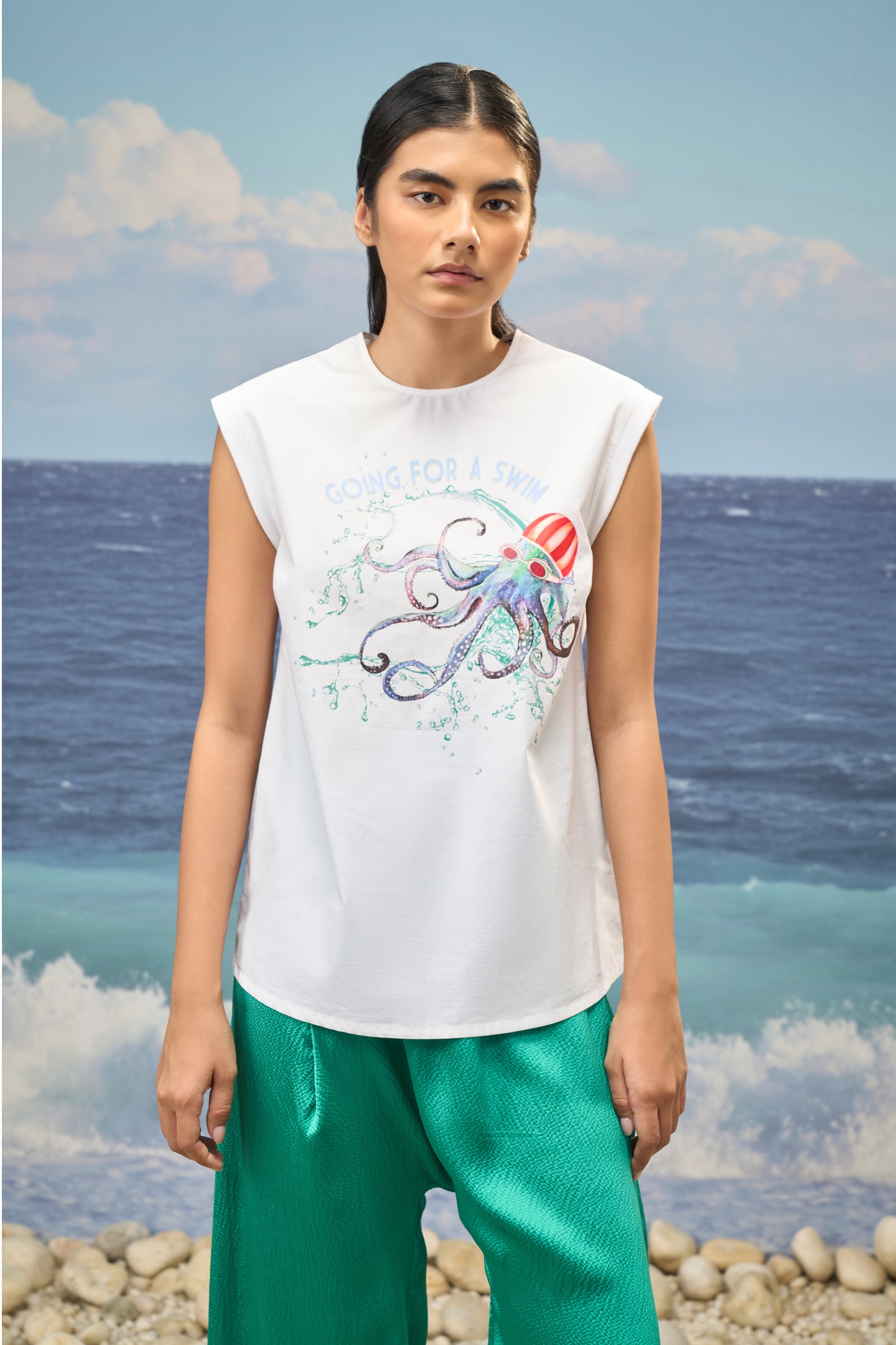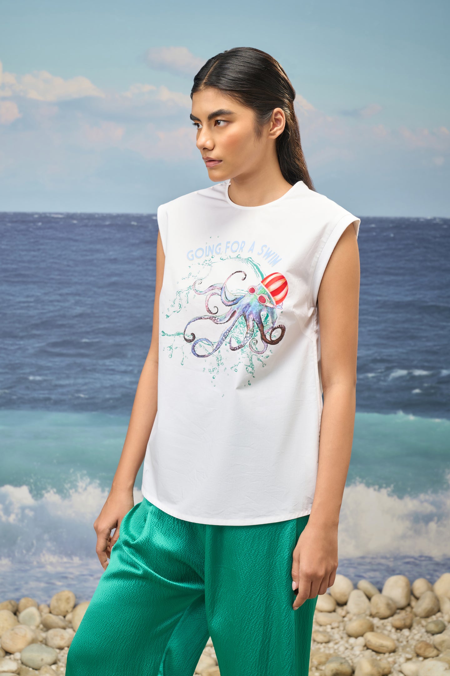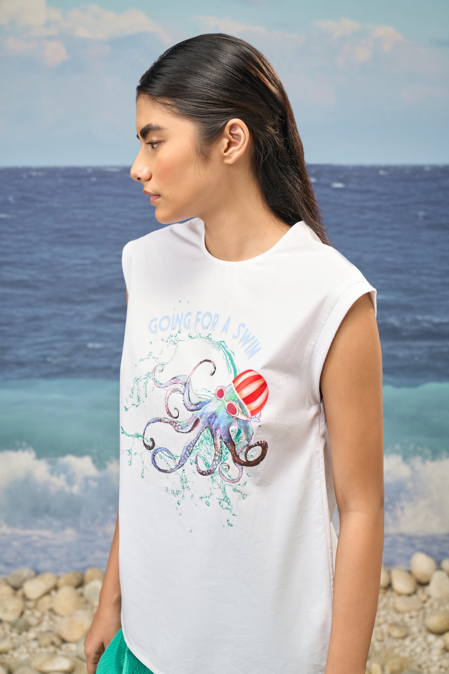 Crafted from premium cotton poplin, this white sleeveless top delivers a crisp, breathable feel with a clean, refined finish. A marine-inspired printed motif adds a playful yet sophisticated accent, while the round neckline and relaxed structure create an effortless, modern silhouette. Lightweight and easy, it’s designed for elevated warm-weather dressing.