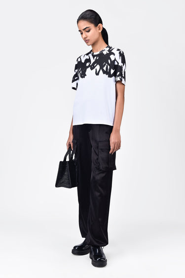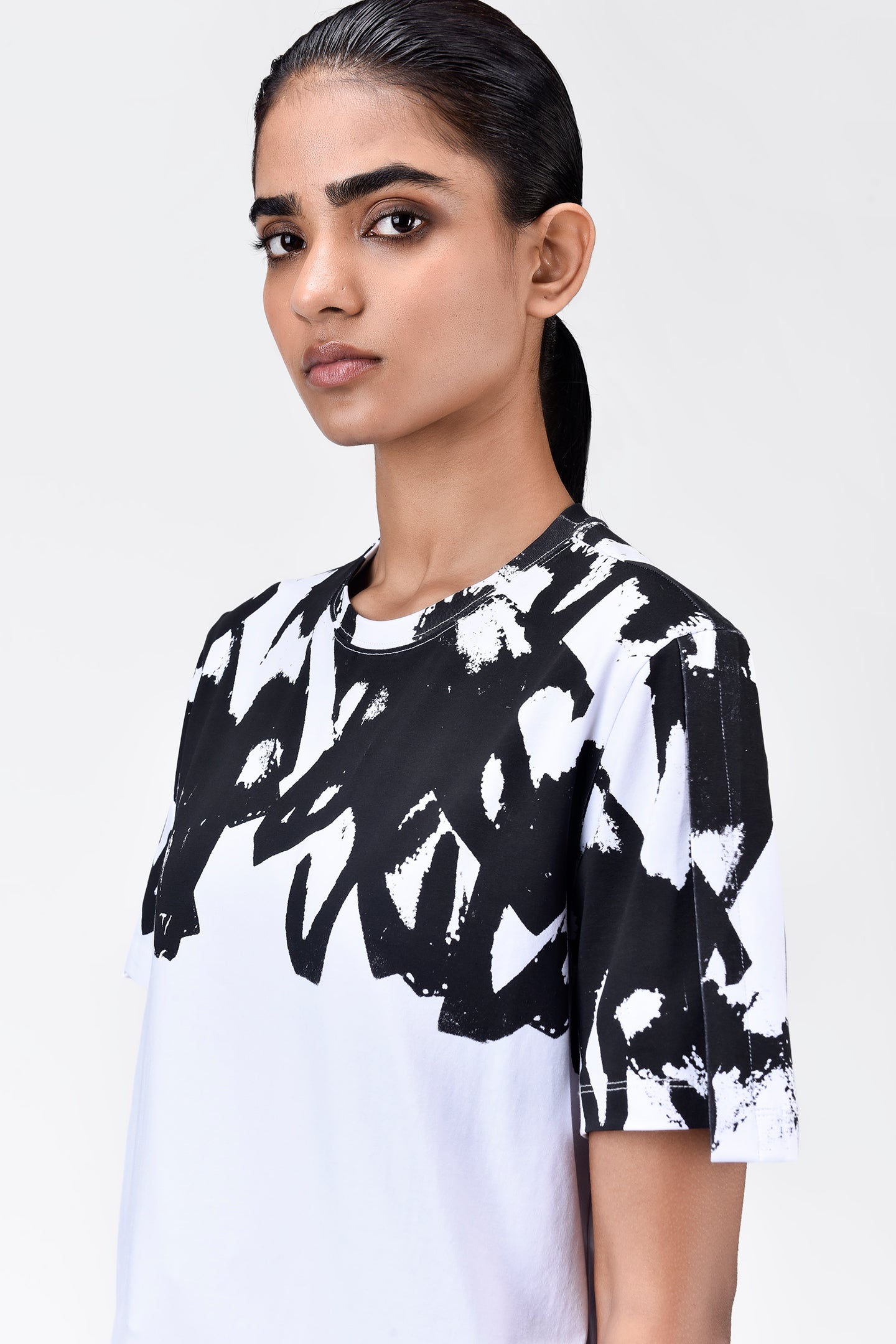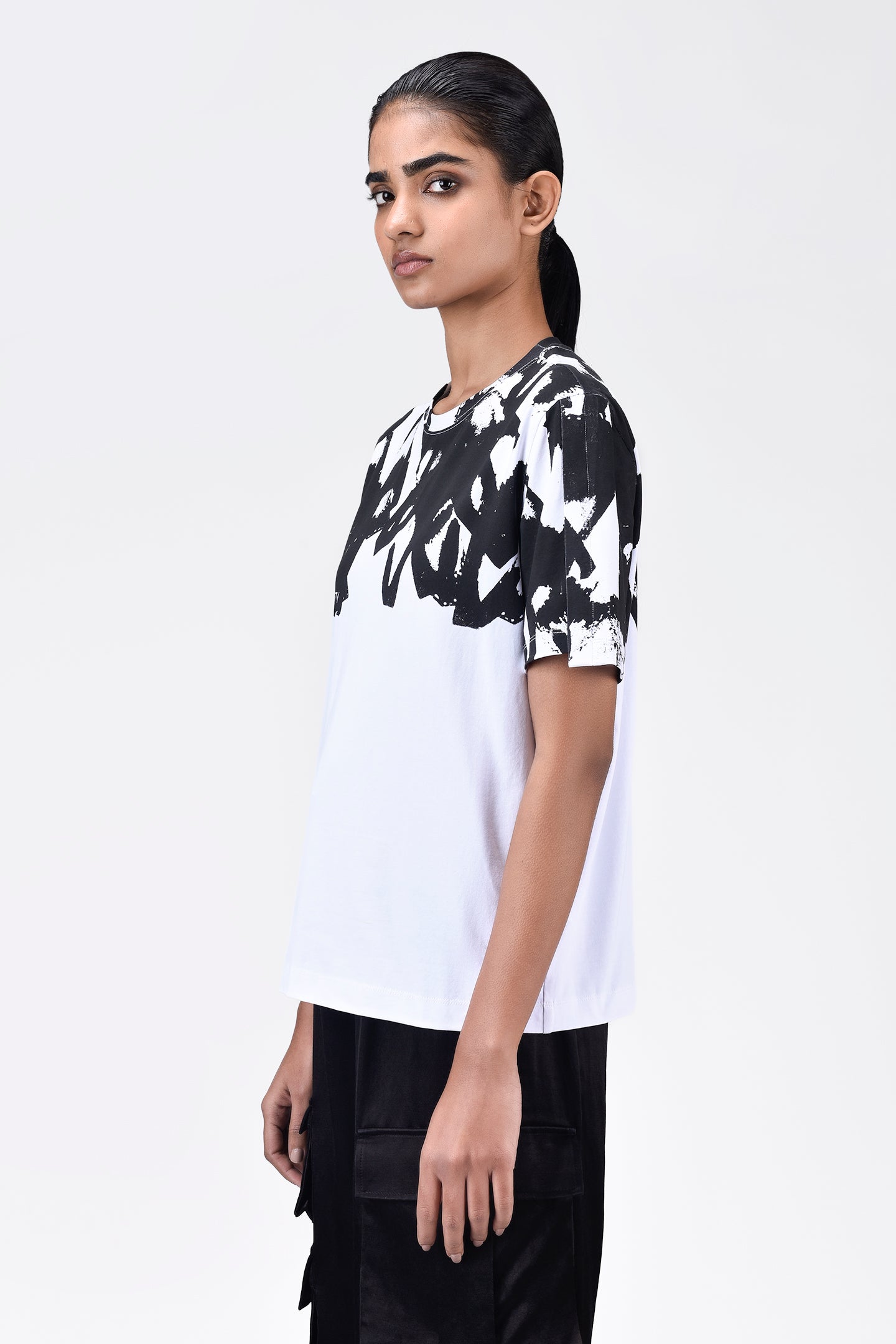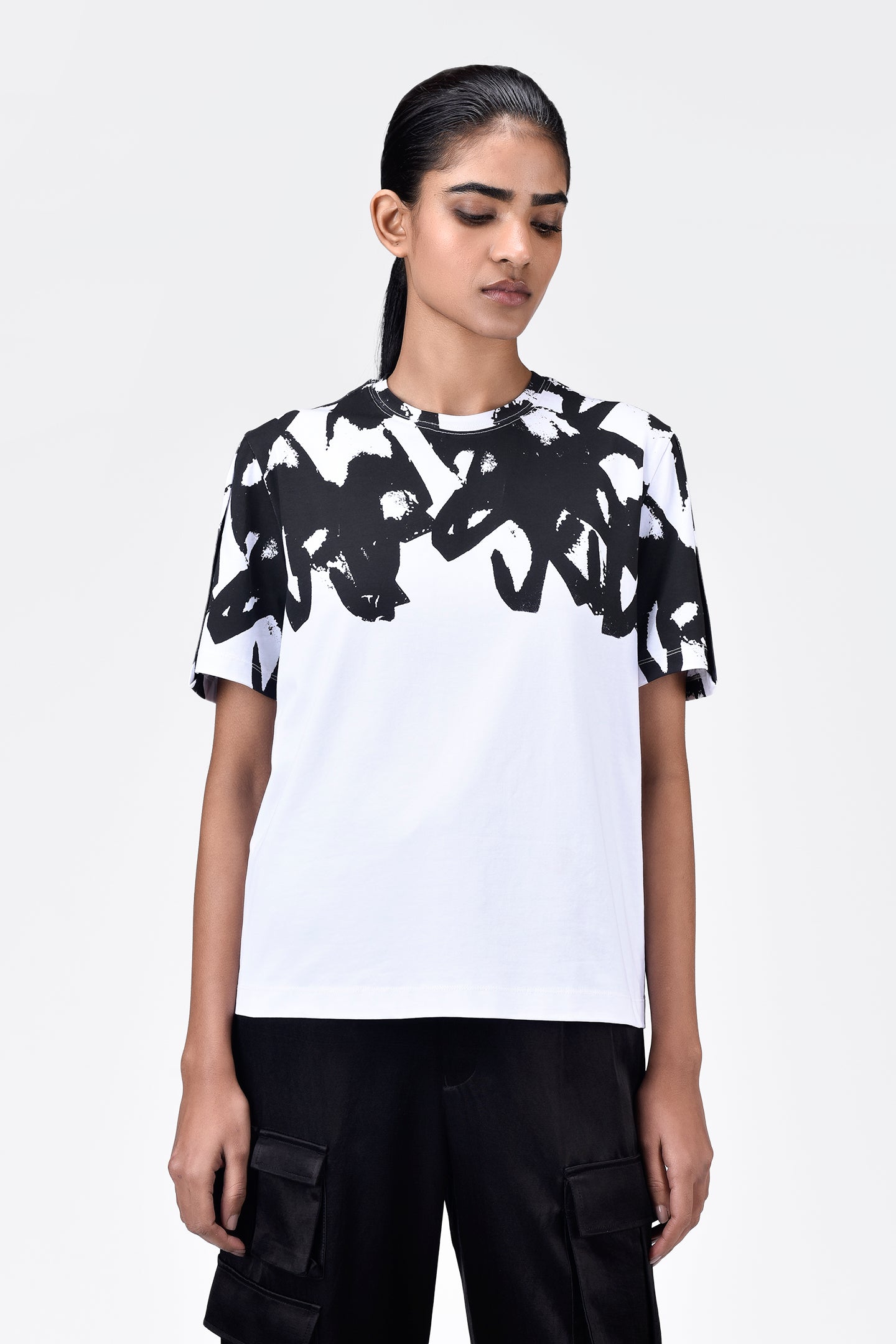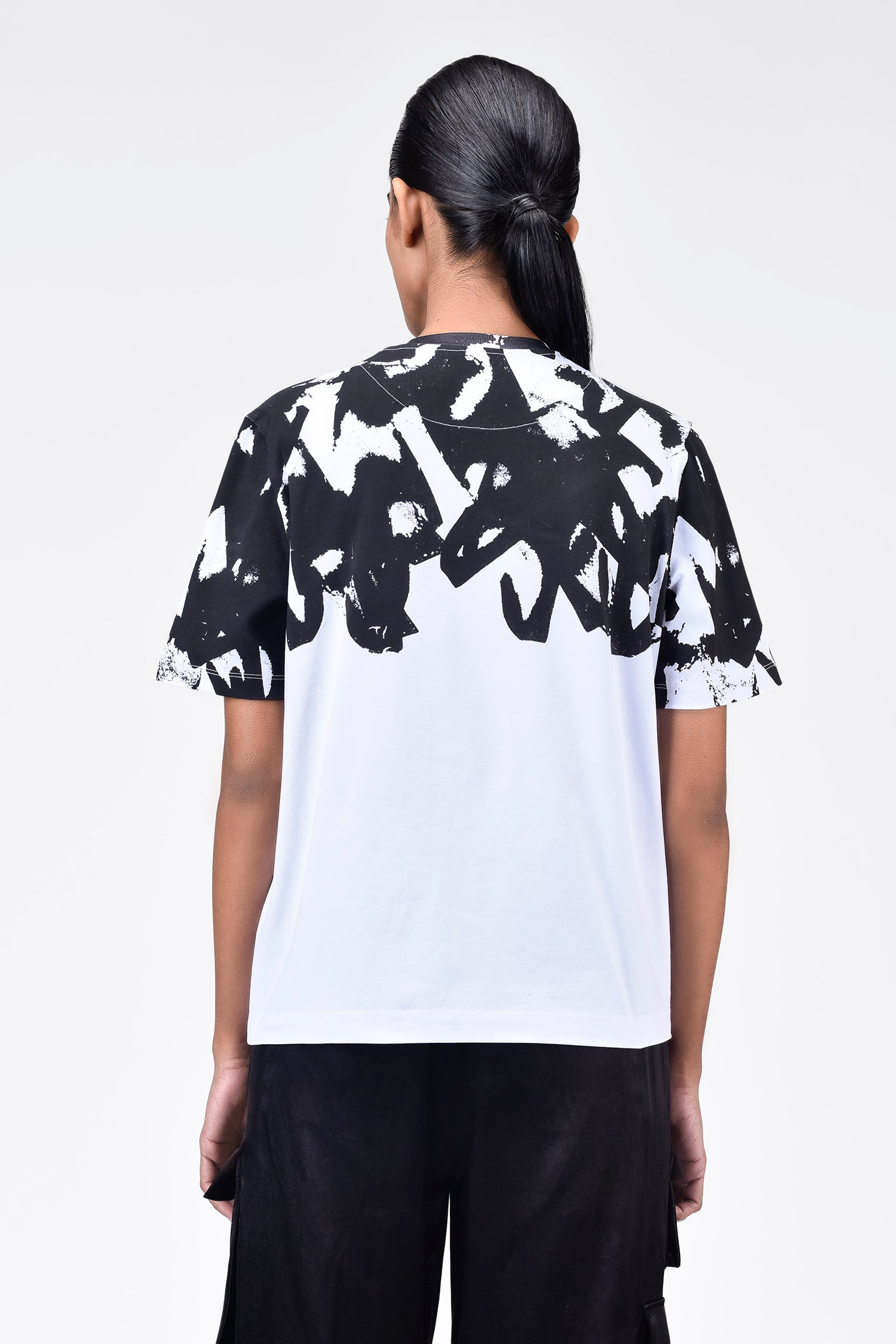 This white regular fit crew neck t-shirt, crafted from cotton single jersey, features an uneven sleeve hem and a striking moth mirage print placement. A versatile and stylish addition to your casual wardrobe.
