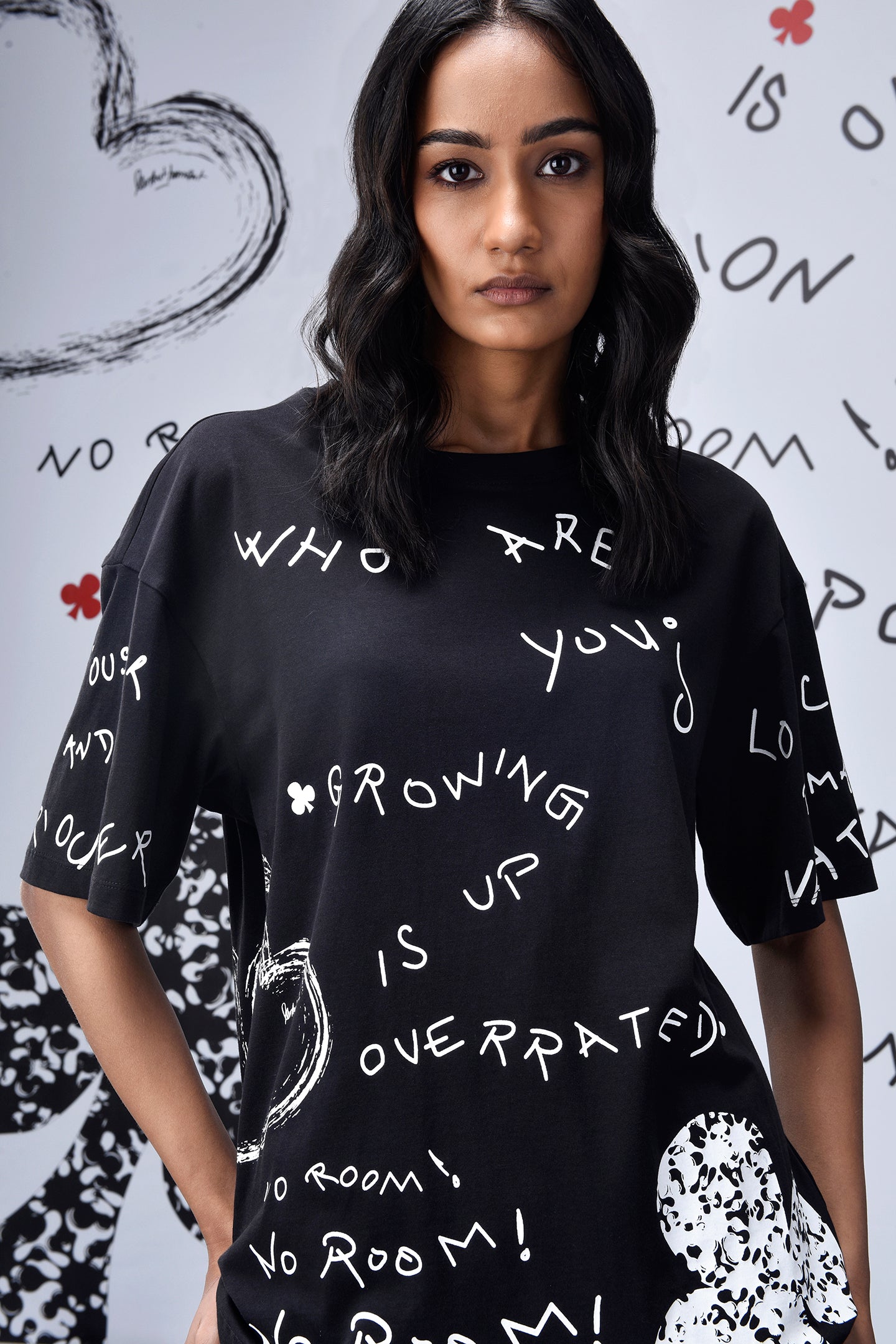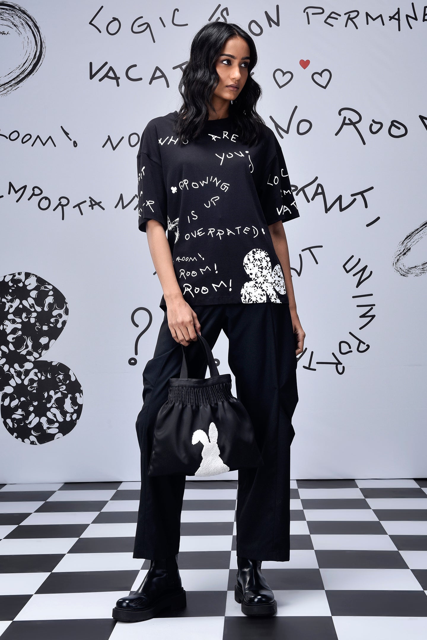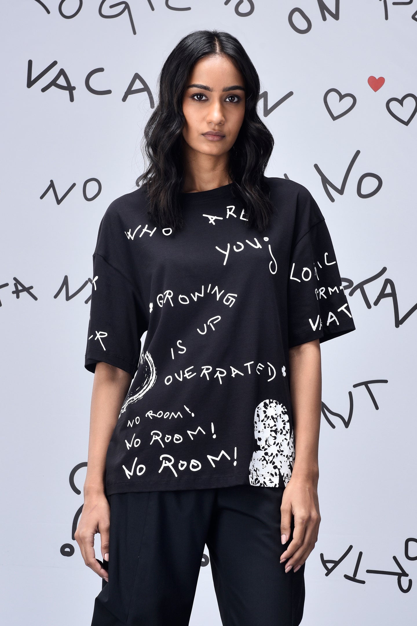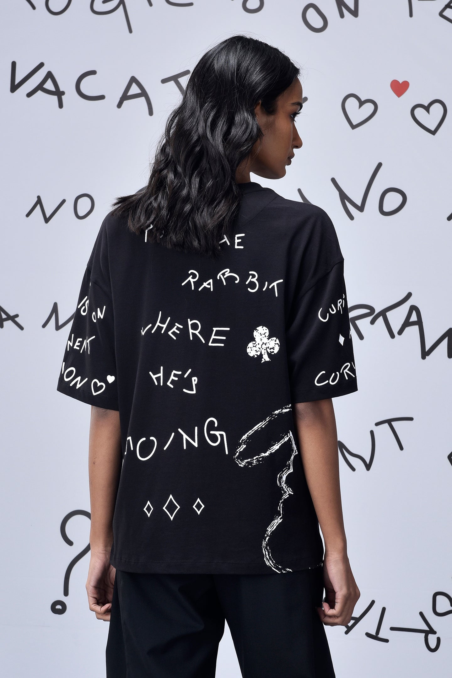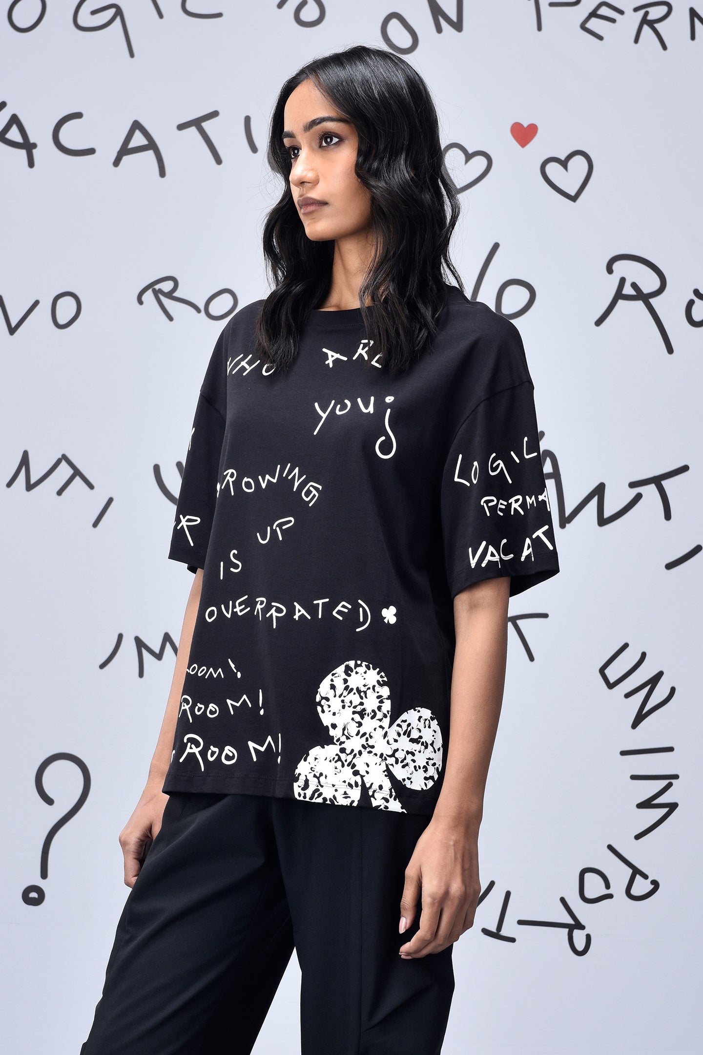 Presenting a casual and comfortable Scribble Scribble Bunny T-Shirt in Black with graffiti type print, evocative expression of joy with wise-crackers that add humor to everyday living.