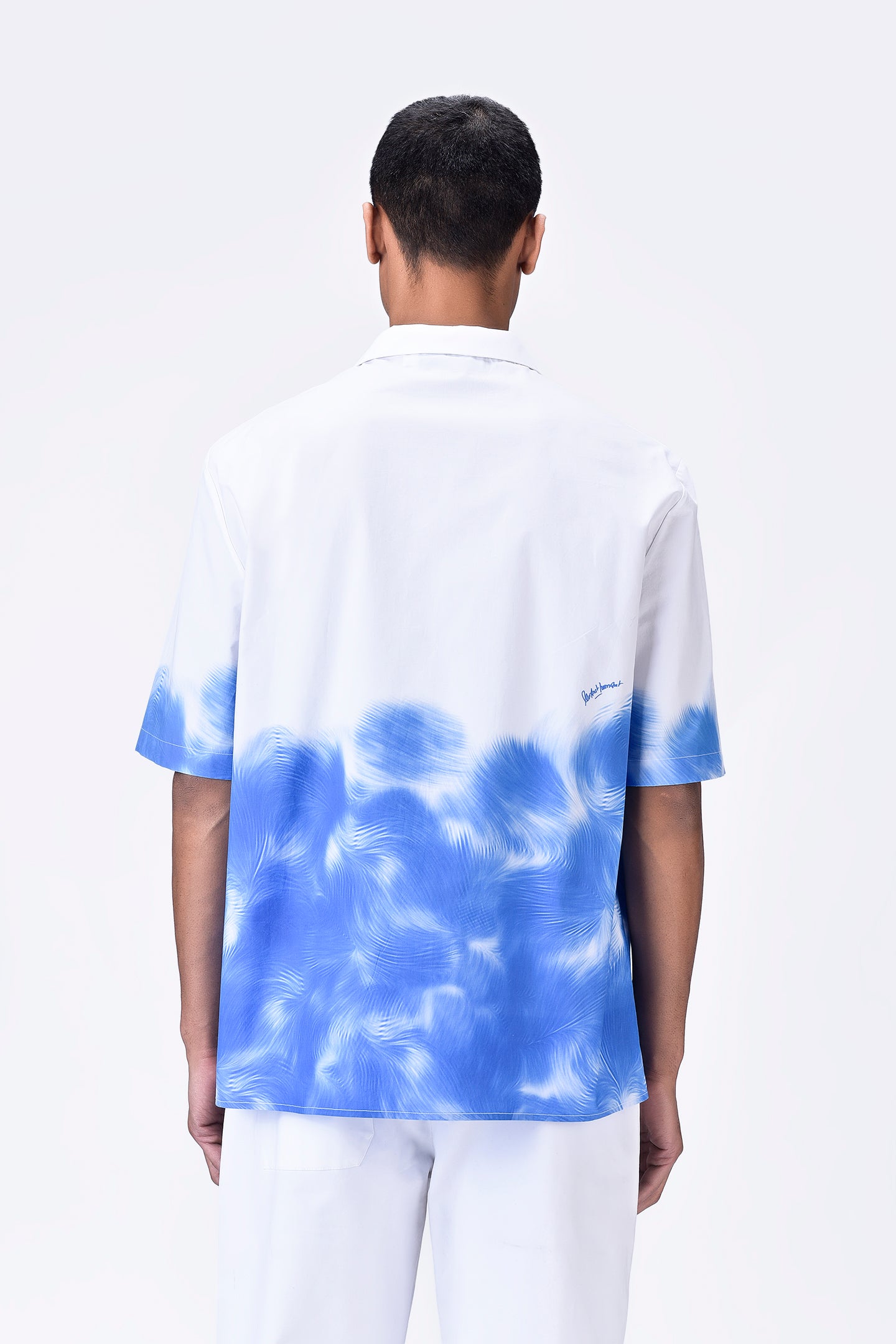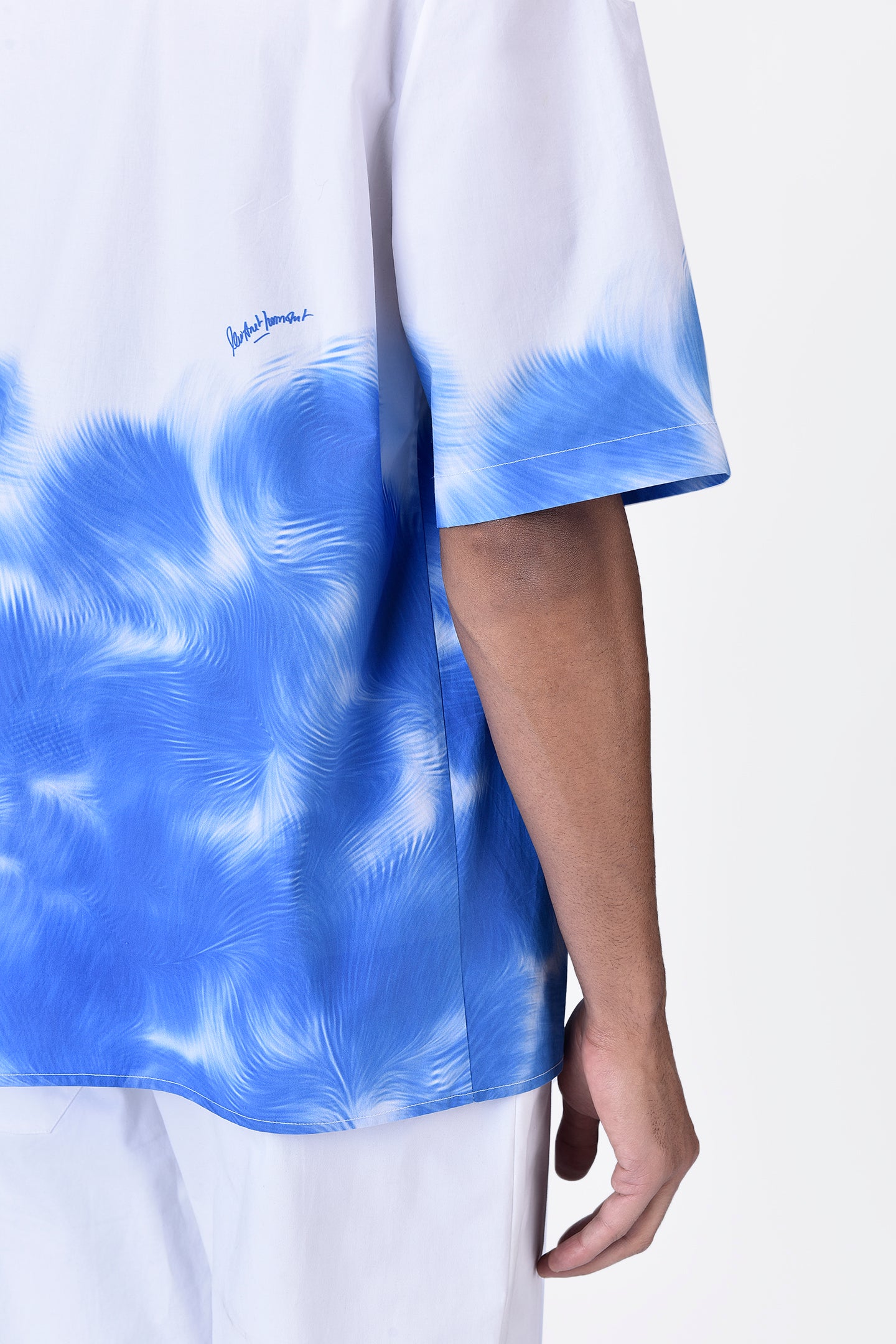 • Starting from the hem and gradually moving towards the center of the shirt, the print appears on the front, back, and sleeves.